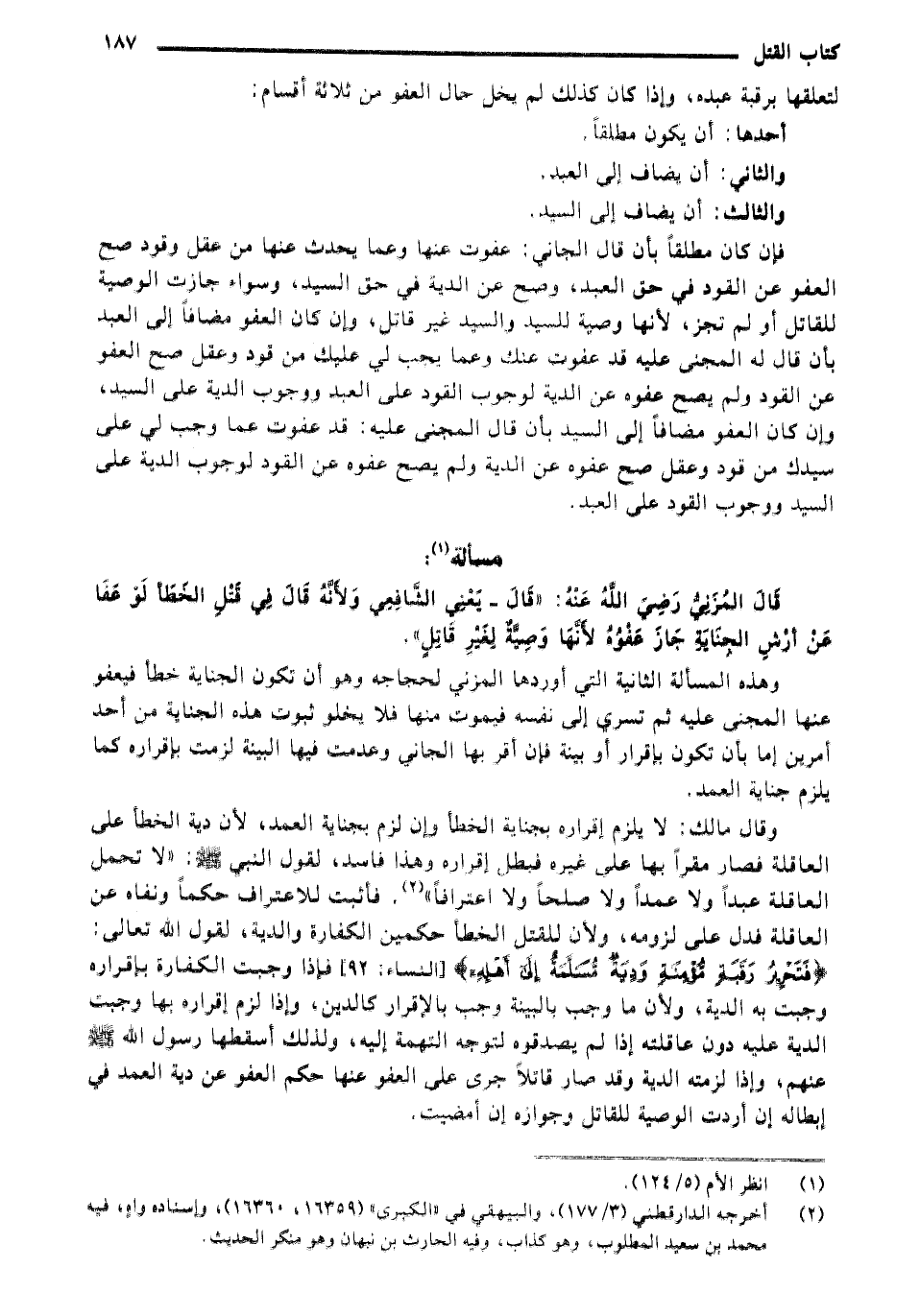 قال المزني رضي الله عنه: ((قال -يعني الشافعي ولأنه قال في قتل الخطأ لو عفا عن أرش الجناية جاز عفوه لأنها وصية لغير فاتل)).