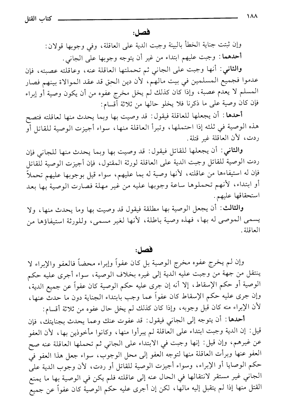 والثاني: أنها وجبت على الجاني ثم تحملتها العاقلة عنه، وعاقلته عصبته، فإن عدموا فجميع المسلمين في بيت مالهم، لأن دين الحق قد عقد الموالاة بينهم فصار المسلم لا يعدم عصبة، وإذا كان كذلك لم يخل مخرج عفوه من أن يكون وصية أو إبراء فإن كان وصية على ما ذكرنا فلا يخلو حالها من ثلاثة أقسام: