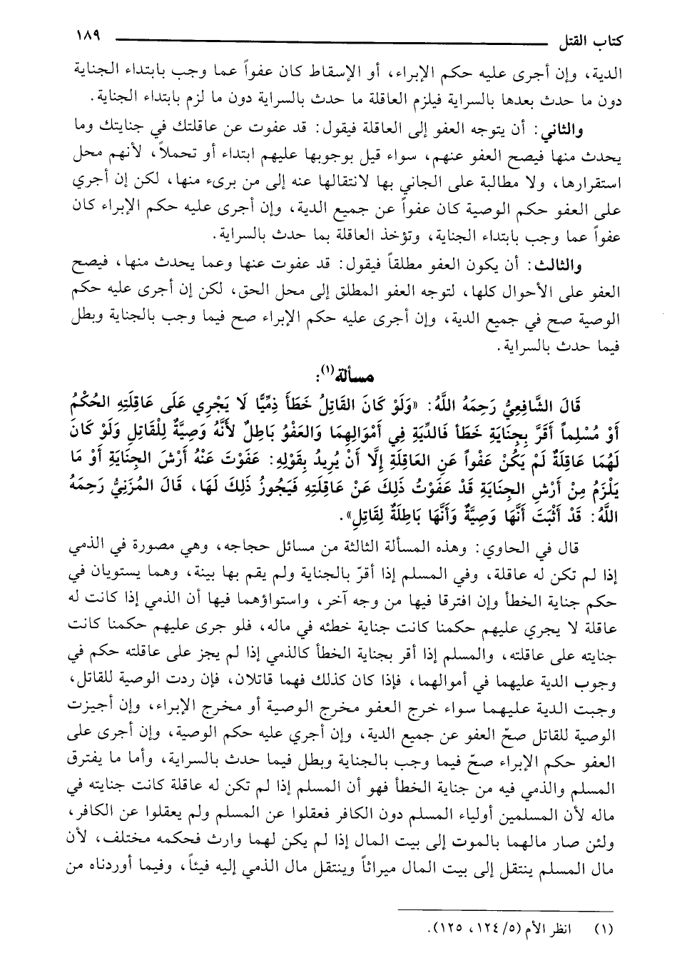 قال الشافعي رحمه الله: ((ولو كان القاتل خطأ ذميا لا يجري على عاتقه الحكم أو مسلما أقر بجناية خطأ فالدية في أموالهما والعفو باطل لأنه وصية للقاتل ولو كان لهما عاقلة لم يكن عفوا عن العاقلة إلا أن يريد بقوله: عفوت عنه أرش الجناية أو ما يلزم من أرش الجناية قد عفوت ذلك عن عاقلته فيجوز ذلك لها، قال المزني رحمه الله: قد أثبت أنها وصية وأنها باطلة لقاتل)).