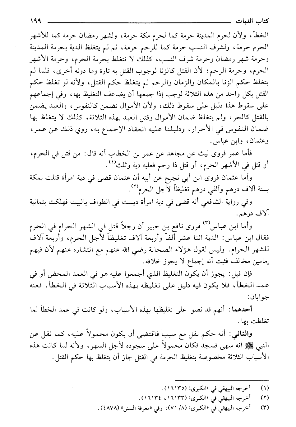 وأما ابن عباس فروى نافع بن جبير أن رجلاً قتل في الشهر الحرام في الحرم فقال ابن عباس: الدية اثنا عشر ألفاً وأربعة آلاف تغليظاً لأجل الحرم، وأربعة آلاف للشهر الحرام. وليس لقول هؤلاء الصحابة رضي الله عنهم مع انتشاره عنهم لأن فيهم إمامين مخالف فثبت أنه إجماع لا يجوز خلافه.