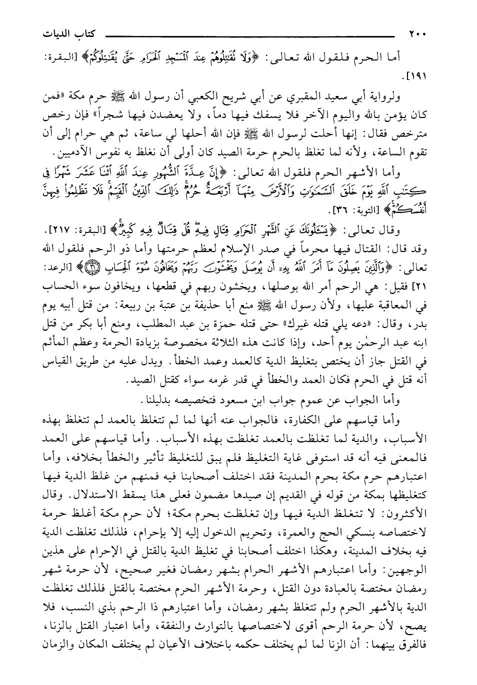 وقال تعالى: {َسْأَلُونَكَ عَنِ الشَّهْرِ الحَرَامِ قِتَالٍ فِيهِ قُلْ قِتَالٌ فِيهِ كَبِيرٌ} [البقرة: 217]. وقد قال: القتال فيها محرماً في صدر الإسلام لعظم حرمتها وأما ذو الرحم فلقول الله تعالى: {والَّذِينَ يَصِلُونَ مَا أَمَرَ اللَّهُ بِهِ أَن يُوصَلَ ويَخْشَوْنَ رَبَّهُمْ ويَخَافُونَ سُوءَ الحِسَابِ} [الرعد: 21] فقيل: هي الرحم أمر الله بوصلها، ويخشون ربهم في قطعها، ويخافون سوء الحساب في المعاقبة عليها، ولأن رسول الله صل الله عليه وسلم منع أبا حذيفة بن عتبة بن ربيعة: من قتل أبيه يوم بدر، وقال: "دعه يلي قتله غيرك "حتى قتله حمزة بن عبد المطلب، ومنع أبا بكر من قتل ابنه عبد الرحمن يوم أحد، وإذا كانت هذه الثلاثة مخصوصة بزيادة الحرمة وعظم المأثم في القتل جاز أن يختص بتغليظ الدية كالعمد وعمد الخطأ. ويدل عليه من طريق القياس أنه قتل في الحرم فكان العمد والخطأ في قدر غرمه سواء كقتل الصيد.