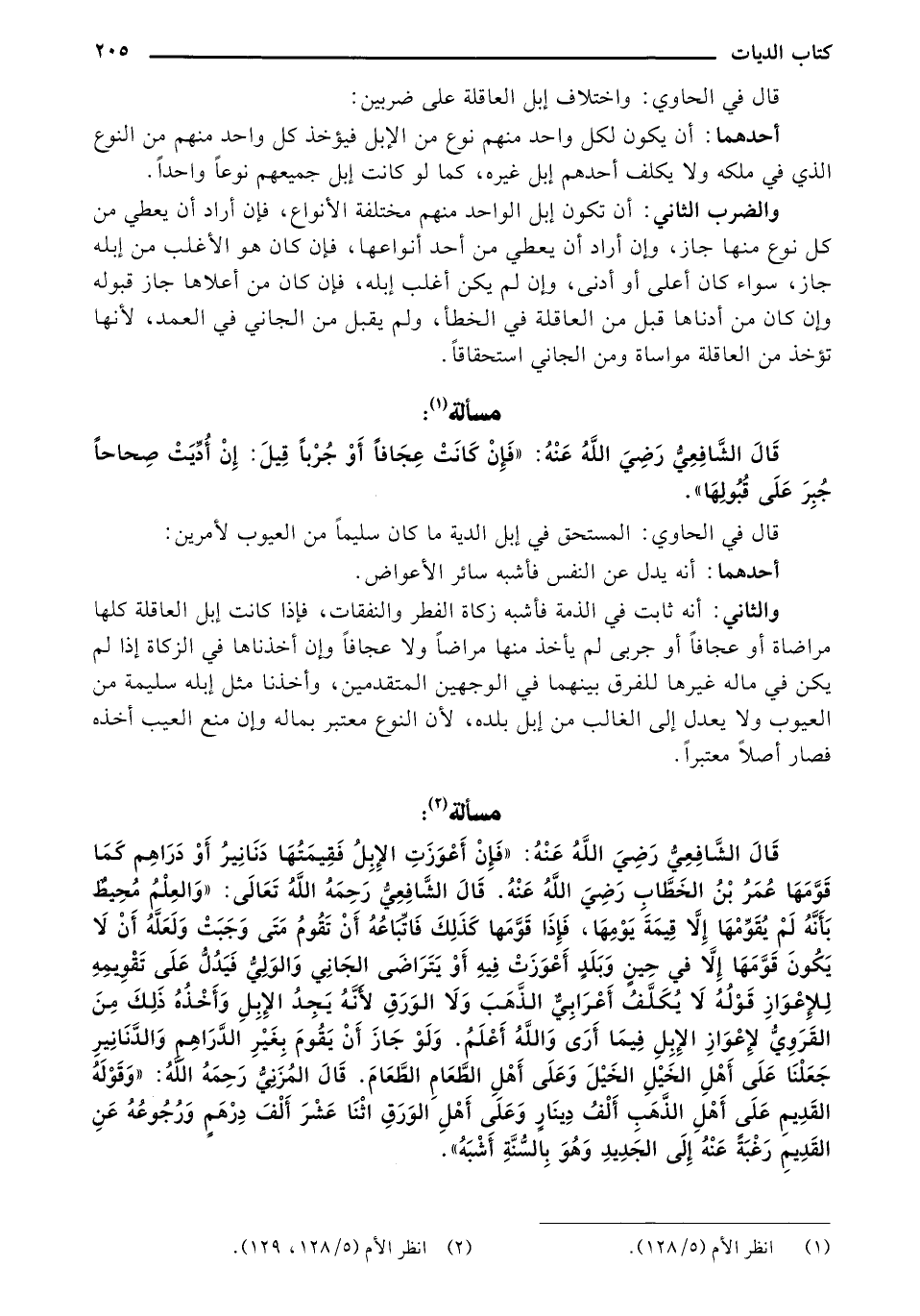 قال الشافعي رضي الله عنه: "فإن أعوزت الإبل فقيمتها دنانير أو دراهم كما قومها عمر بن الخطاب رضي الله عنه. قال الشافعي رحمه الله تعالى: "والعلم محيط بأنه لم يقومها إلا قيمة يومها, فإذا قومها كذلك فإتباعه أن تقوم متى وجبت ولعله أن لا يكون قومها إلا في حين وبلد أعوزت فيه أو يتراضى الجاني والولي فيدل على توقيمه للإعواز قوله لا يكلف أعرابي الذهب ولا الورق لأنه يجد الإبل وأخذه ذلك من القروي لإعواز الإبل فيما أرى الله وأعلم. ولو جاز أن يقوم بغير الدراهم والدنانير جعلنا على أهل الخيل الخيل وعلى أهل الطعام الطعام. قال المزني رحمه الله: "وقوله القديم على أهل الذهب ألف دينار وعلى أهل الورق اثنا عشر ألف درهم ورجوعه عن القديم رغبة عنه إلي الجديد وهو (بالسنة) أشبه".