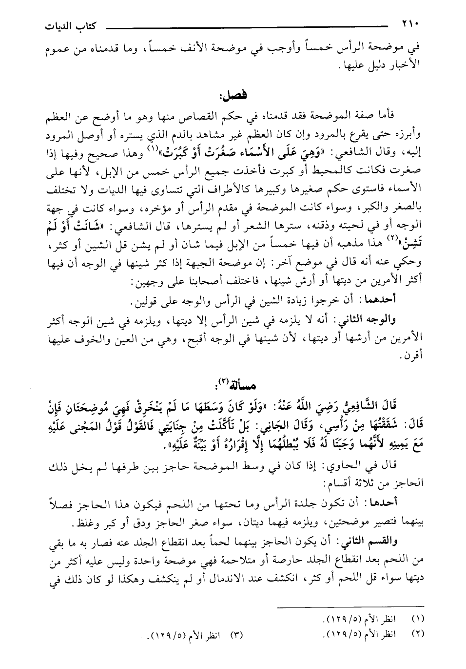 فأما صفة الموضحة فقد قدمناه في حكم القصاص منها وهو ما أوضح عن العظم وأبرزه حتى يقرع بالمرود وإن كان العظم غير مشاهد بالدم الذي يستره أو أوصل المرود إليه, وقال الشافعي: "وهي على الأسماء صغرت أو كبرت" وهذا صحيح وفيها إذا صغرت فكانت كالمحيط أو كبرت فأخذت جميع الرأس خمس من الإبل, لأنها على الأسماء فاستوي حكم صغيرها وكبيرها كالأطراف التي تتساوى فيها الديات ولا تختلف بالصغر والكبر, وسواء كانت الموضحة في مقدم الرأس أو مؤخره, وسواء كانت في جهة الوجه أو في لحيته وذقنه, سترها الشعر أو لم يسترها, قال الشافعي: "شانت أو لم تشن" هذا مذهب أن فيها خمسًا من الإبل فيما شان أو لم يشن قل الشين أو كثر, وحكي عنه أنه قال في موضع آخر: إن موضحة الجبهة إذا كثر شينها في الوجه أن فيها أكثر الأمرين من ديتها أو أرش شينها, فاختلف أصحابنا على وجهين: