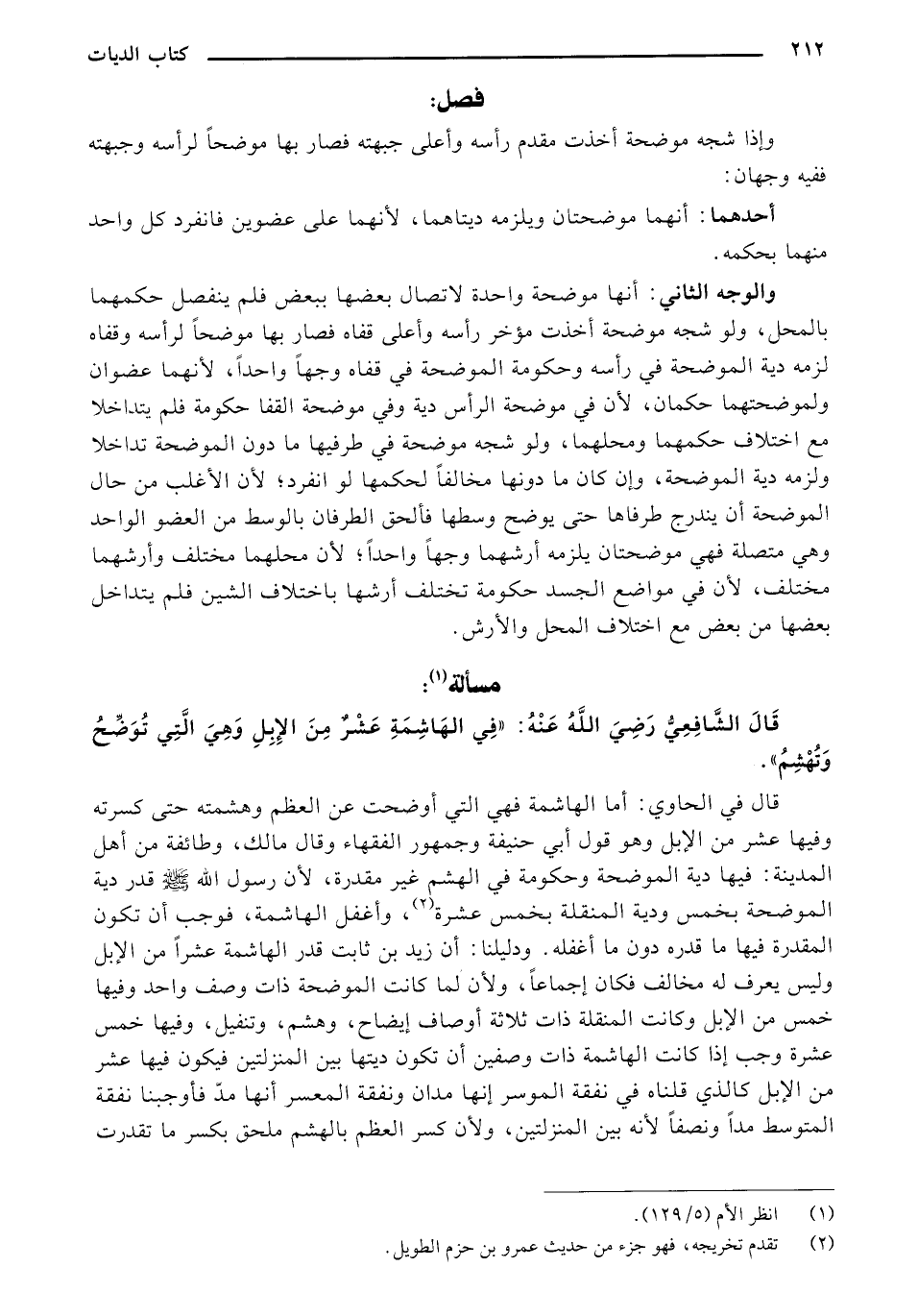 قال الشافعي رضي الله عنه: "في الهاشمة عشر من الإبل وهي التي توضح وتهشم".