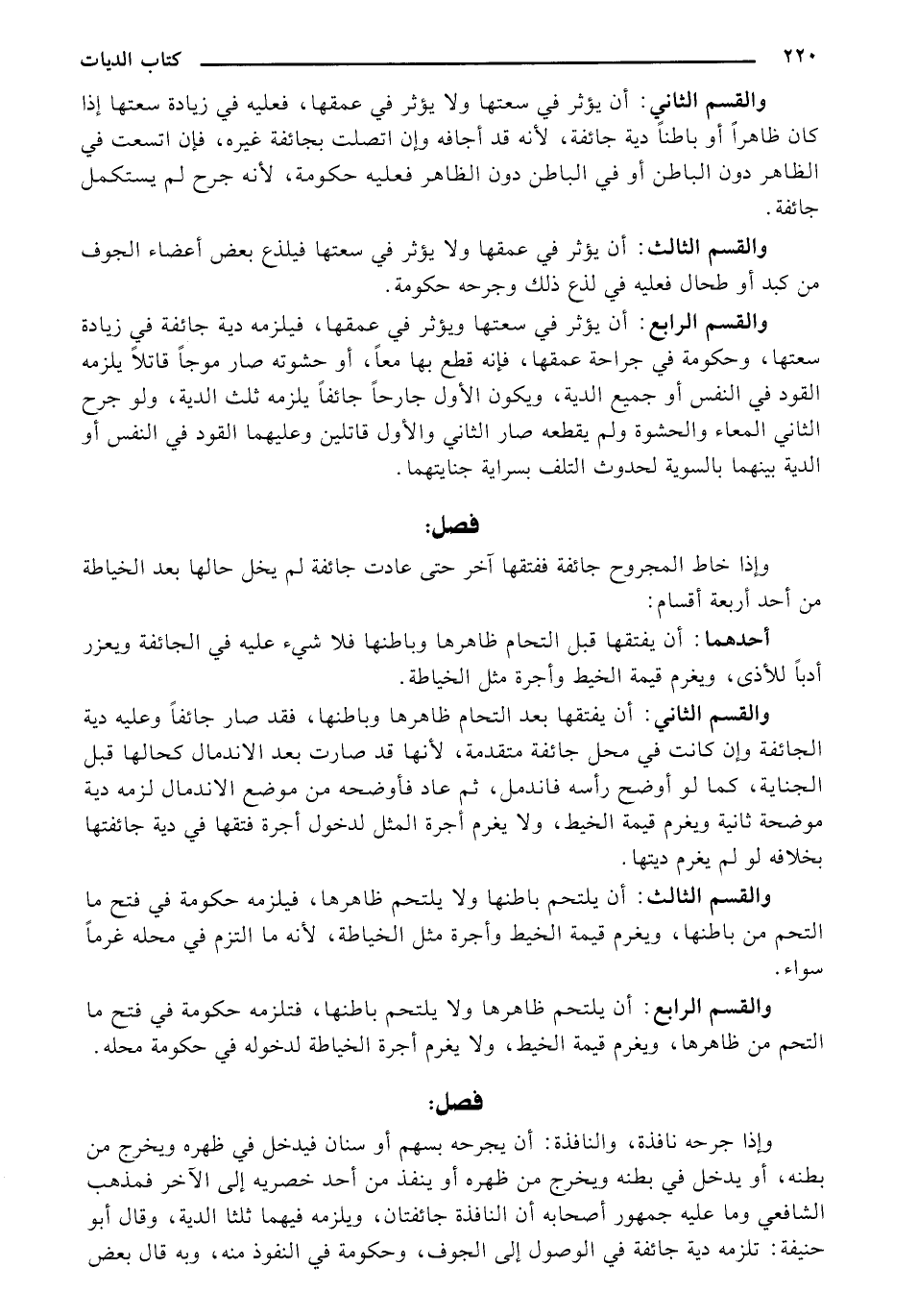 والقسم الرابع: أن يؤثر في سعتها ويؤثر في عمقها, فيلزمه دية جائفة في زيادة سعتها, وحكومة في جراحة عمقها, فإنه قطع بها معًا, أو حشو صار موجًا قاتلًأ يلزمه القود في النفس أو جميع الدية, ويكون الأول جارحًا جائفًا يلزمه ثلث الدية, ولو جرح الثاني المعاء والحشوة ولم يقطعه صار الثاني والأول قاتلين وعليهما القود في النفس أو الدية بينهما بالسوية لحدوث التلف بسراية جنايتهما.