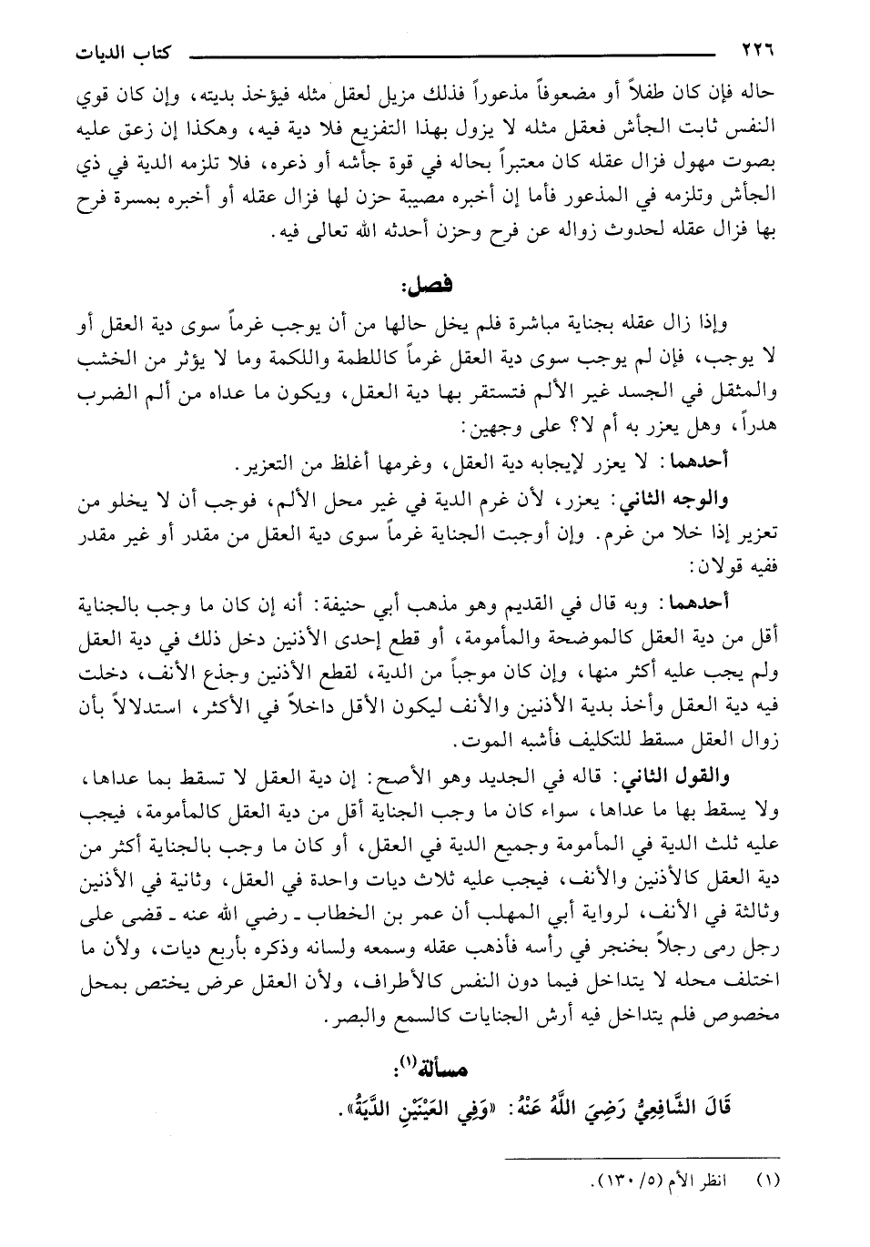 والقول الثاني: قاله في الجديد وهو الأصح: إن دية العقل لا تسقط بما عداها, ولا يسقط بها ما عداها, سواء كان ما وجب الجناية أقل من دية العقل كالمأمومة, فيجب عليه ثلث الدية في المأمومة وجميع الدية في العقل, أو كان ما وجب بالجناية أكثر من دي العقل كالأذنين والأنف, فيجب عليه ثلاث ديات واحدة في العقل, وثانية في الأذنين وثالثة في الأنف, لرواية أبي المهلب أن عمر بن الخطاب-رضي الله عنه-قضى على رجل رمى رجلًا بخنجر في رأسه فأذهب عقله وسمعه ولسانه وذكره بأربع ديات, ولأن ما اختلف محله لا يتداخل فيما دون النفس كالأطراف, ولأن العقل عرض يختص بمحل مخصوص فلم يتداخل فيه أرش الجنايات كالسمع والبصر.