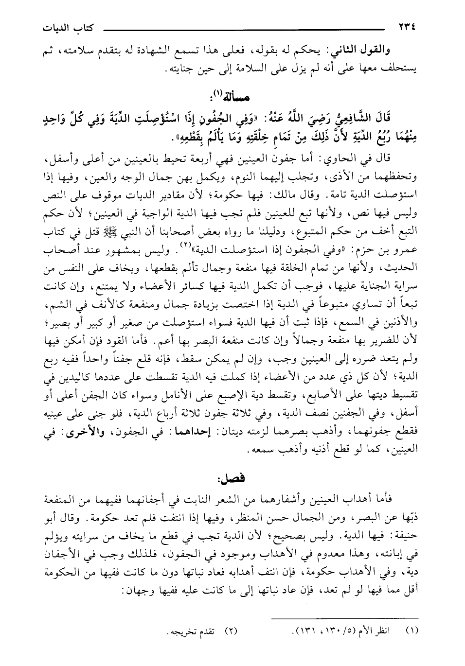 قال الشافعي رضي الله عنه: "وفي الجفون إذا استؤصلت الدية وفي كل واحد منهما ربع الدية لأن ذلك من تمام خلقته وما يألم بقطعه".