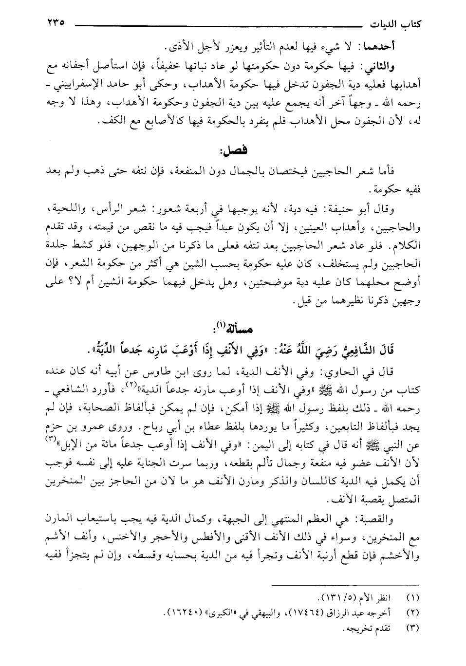 والقصبة: هي العظم المنتهي إلى الجبهة، وكمال الدية فيه يجب باستيعاب المارن مع المنخرين، وسواء في ذلك الأنف الأقنى والأفطس والأحجر والأخنس، وأنف الأشم والأخشم فإن قطع أرنبة الأنف وتجرأ فيه من الدية بحسابه وقسطه، وإن لم يتجزأ ففيه