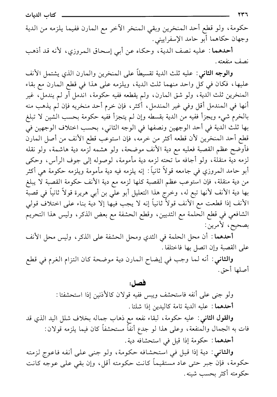 والوجه الثاني: عليه ثلث الدية تقسيطًا على المنخرين والمارن الذي يشتمل الأنف عليها، فكان في كل واحد منهما ثلث الدية، ويلزمه على هذا في قطع المارن مع بقاء المنخرين ثلث الدية، ولو شق المارن، ولم يقطعه ففيه حكومة، اندمل أو لم يندمل، غير أنها في المندمل أقل وفي غير المندمل، أكثر، فإن خرم أحد منخريه فإن لم يذهب منه بالخرم شيء ويجزأ ففيه من الدية بقسطه وإن لم يتجزأ ففيه حكومة بحسب الشين لا تبلغ بها ثلث الدية في أحد الوجهين ونصفها في الوجه الثاني، بحسب اختلاف الوجهين في قطع أحد المنخرين لأن قطعه أكثر من خرمه، فإن استوعب قطع الأنف من أصل المارن فأوضح عظم القصبة فعليه مع دية الأنف موضحة، ولو هشمه لزمه دية هاشمة، ولو نقله لزمه دية منقلة، ولو أجافهما تحته لزمه دية مأمومة، لوصوله إلى جوف الرأس، وحكي أبو حامد المروزي في جامعه قولًا ثانيًا: إنه يلزمه فيه دية مأمومة ويلزمه حكومة القصبة لا يبلغ بها دية الأنف لأنها تبع له، وخرج هذا التعليل أبو علي بن أبي هريرة قولًا ثانيًا في قصبة الأنف إذا قطعت مع الأنف قولًا ثانيًا إنه لا يجب فيها إلا دية بناء على اختلاف قولي الشافعي في قطع الحلمة مع الثديين، وقطع الحشفة مع بعض الذكر، وليس هذا التحريم بصحيح، لأمرين: