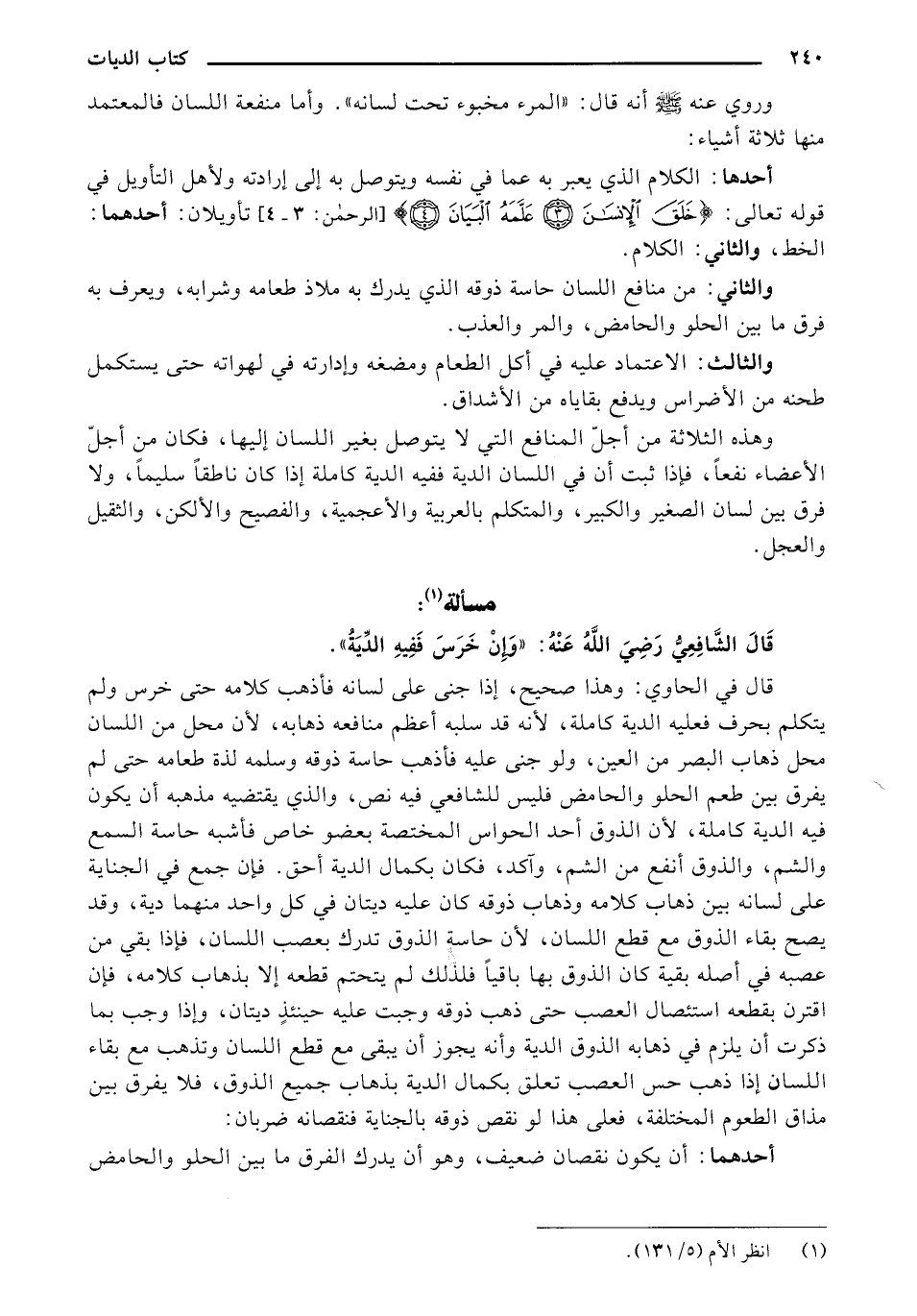وهذه الثلاثة من أجلّ المنافع التي لا يتوصل بغير اللسان إليها، فكان من أجلّ الأعضاء نفعًا، فإذا ثبت أن في اللسان الدية ففيه الدية كاملة إذا كان ناطقًا سليمًا، ولا فوق بين لسان الصغير والكبير، والمتكلم بالعربية والأعجمية، والفصيح والألكن، والثقيل والعجل.