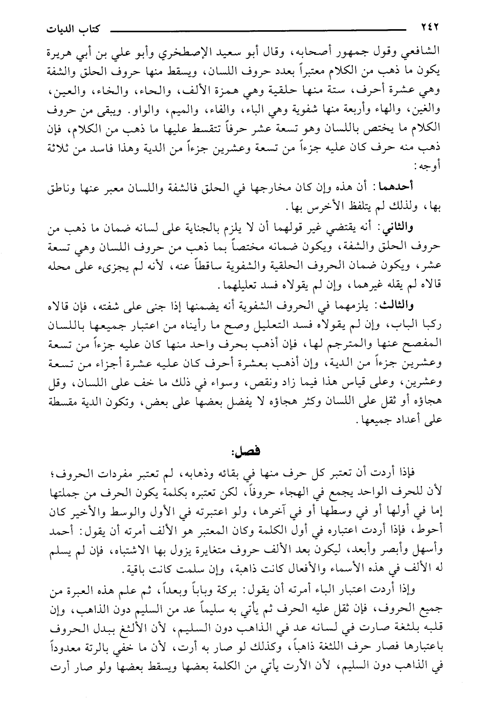 الشافعي وقول جمهور أصحابه، وقال أبو سعيد الإصطخري وأبو علي بن أبي هريرة يكون ما ذهب من الكلام معتبرًا بعدد حروف اللسان، ويسقط منها حروف الحلق والشفة وهي عشرة أحرف، ستة منها حلقية وهي همزة الألف، والحاء، والخاء، والعين، والغين، والهاء وأربعة منها شفوية وهي الباء، والفاء، والميم، والواو. ويبقى من حروف الكلام ما يختص باللسان وهي تسعة عشر حرفًا تتقسط عليها ما ذهب من الكلام، فإن ذهب منه حرف كان عليه جزءًا من تسعة وعشرين جزءًا من الدية وهذا فاسد من ثلاثة أوجه:
