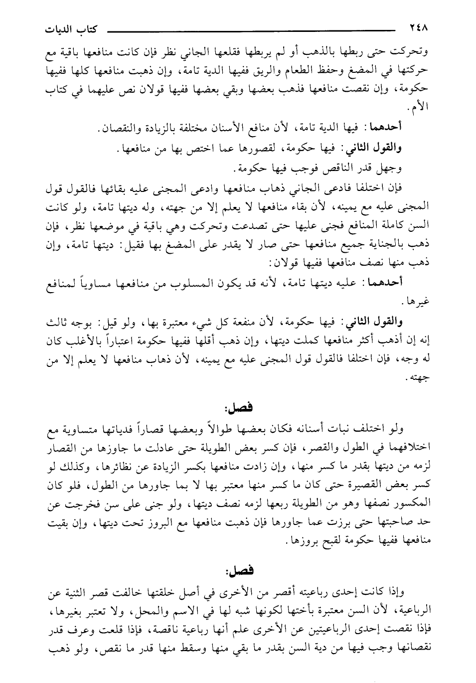 وإذا كانت إحدى رباعيته أقصر من الأخرى في أصل خلقتها خالفت قصر الثنية عن الرباعية، لأن السن معتبرة بأختها لكونها شبه لها في الاسم والمحل، ولا تعتبر بغيرها، فإذا نقصت إحدى الرباعيتين عن الأخرى علم أنها رباعية ناقصة، فإذا قلعت وعرف قدر نقصانها وجب فيها من دية السن بقدر ما بقى منها وسقط منها قدر ما نقص، ولو ذهب