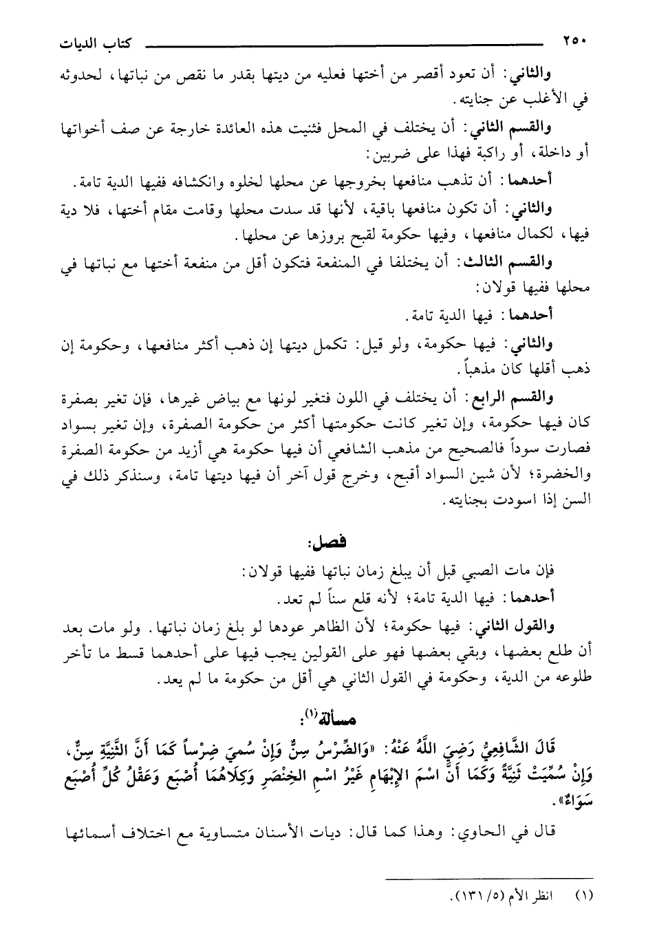 قال الشافعي رضي الله عنه: "والضرس سن وإن سمي ضرسًا كما أن الثنية سن، وإن سميت ثنية وكما أن اسم الإبهام غير اسم الخنصر وكلاهما أصبع وعقل كل أصبع سواء".
