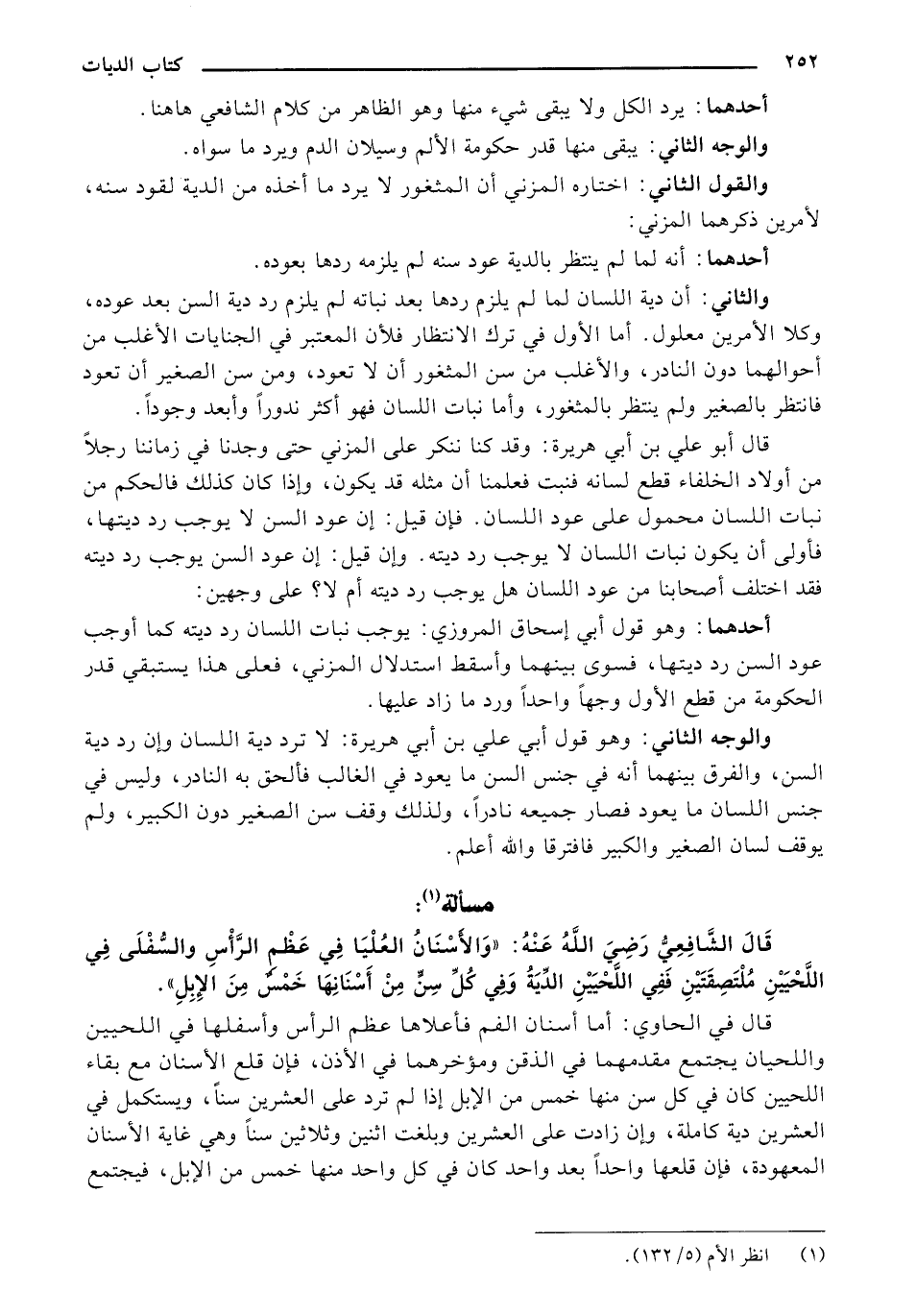 قال الشافعي رضي الله عنه: "والأسنان العليا في عظم الرأس والسفلى في اللحيين ملتصقتين ففي اللحيين الدية وفي كل سنة من أسنانها خمس من الإبل".