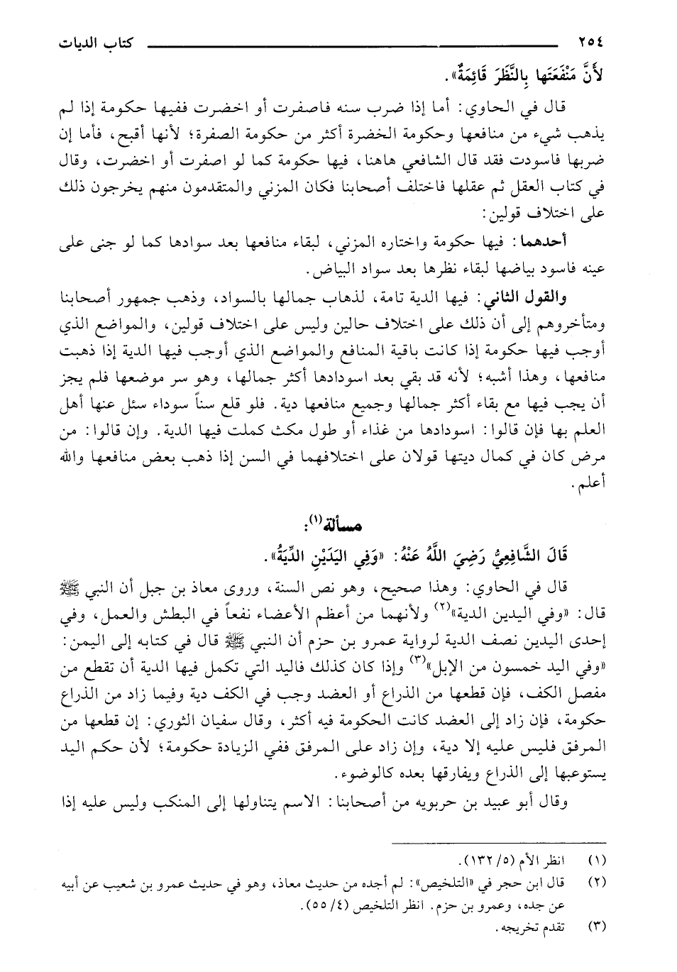 والقول الثاني: فيها الدية تامة, لذهاب جمالها بالسواد, وذهب جمهور أصحابنا ومتأخرون إلى أن ذلك على اختلاف حالين وليس على اختلاف قولين, والمواضع الذي أوجب فيها حكومة إذا كانت باقية المنافع والمواضع الذي أوجب فيها الدية إذا ذهبت منافعها, وهذا أشبه؛ لأنه قد بقي بعد اسودادها أكثر جمالها, وهو سر موضعها فلم يجز أن يجب فيها مع بقاء أكثر جمالها وجميع منافعها دية, فلو قلع سنًا سوداء سئل عنها أهل العلم بها فإن قالوا: اسودادها من غذاء أو طول مكث كملت فيها الدية, وإن قالوا: من مرض كان في كمال ديتها قولان على اختلافهما في السن إذا ذهب بعض منافعها والله أعلم.