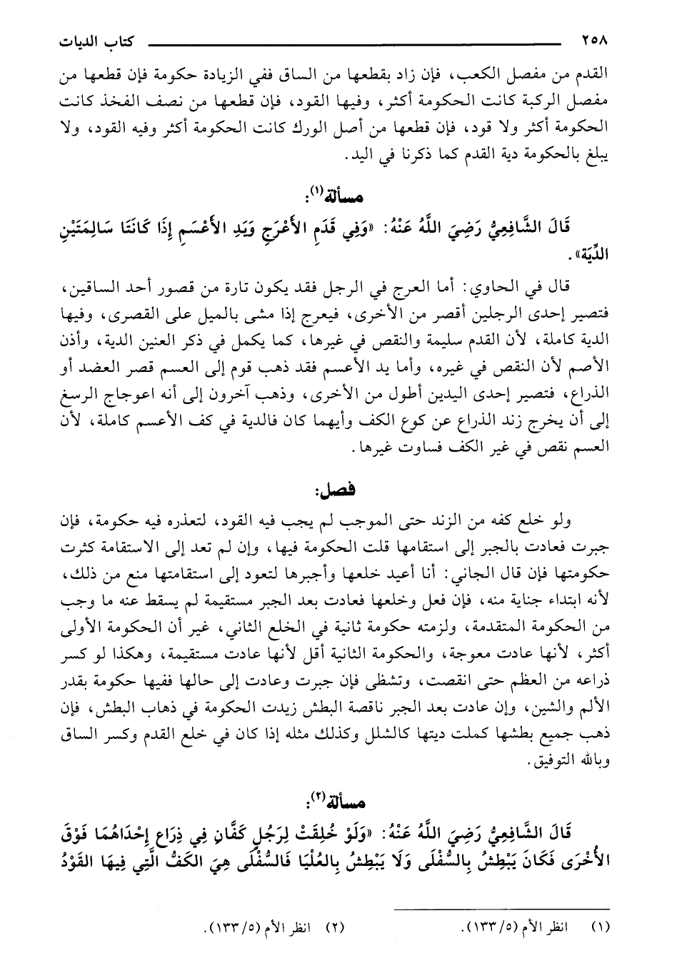 قال الشافعي رضي الله عنه: "وفي قدم الأعرج ويد الأعسم إذا كانتا سالمتين الدية".
