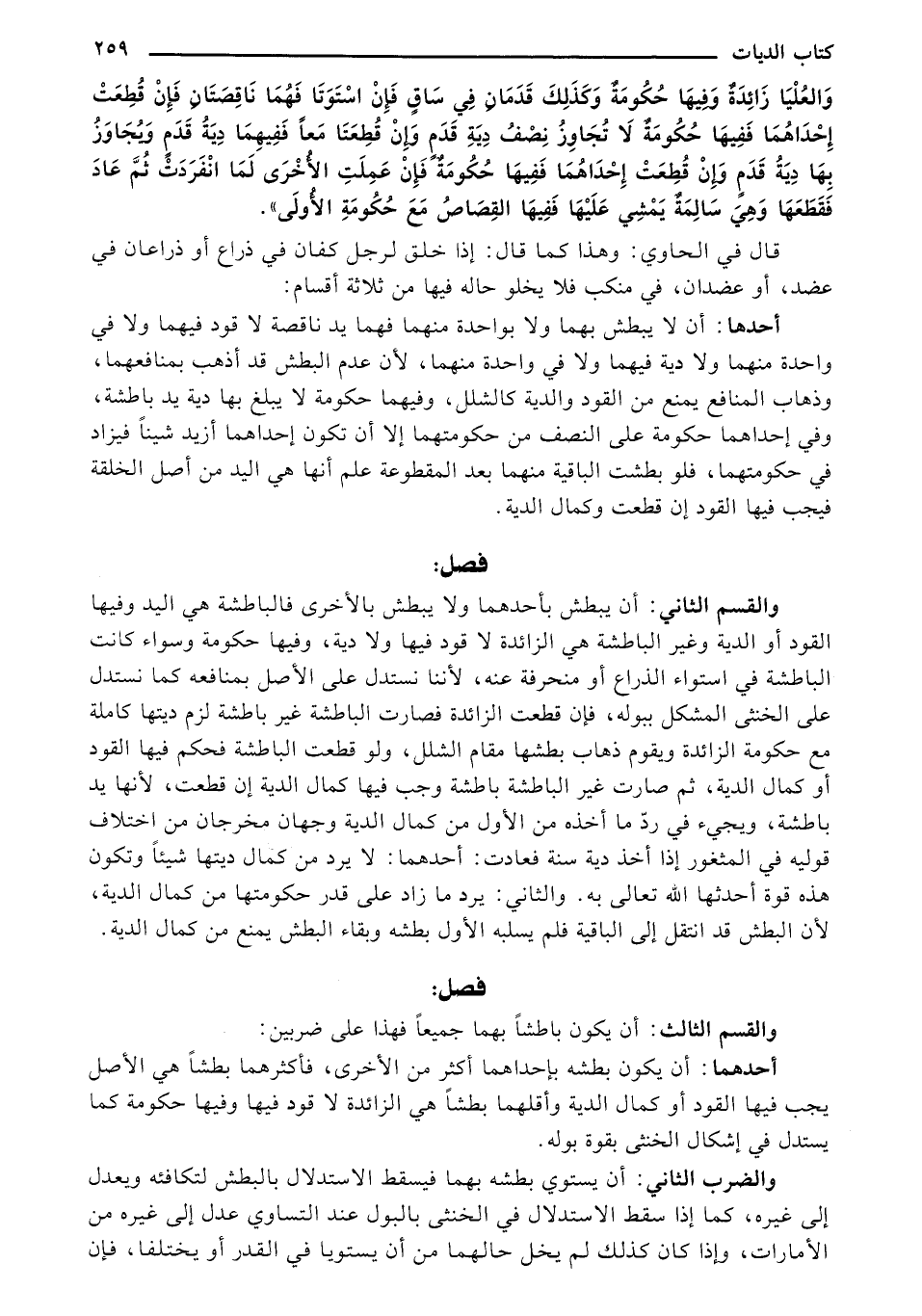 والقسم الثاني: أن يبطش بأحدهما ولا يبطش بالأخرى فالباطشة هي اليد وفيها القود أو الدية وغير الباطشة هي الزائدة لا قود فيها ولا دية, وفيها حكومة وسواء كانت الباطشة في استواء الذراع أو منحرفة عنه, لأننا نستدل على الأصل بمنافعه كما نستدل على الخنثى المشكل ببوله, فإن قطعت الزائدة فصارت الباطشة غير باطشة لزم ديتها كاملة مع حكومة الزائدة ويقوم ذهاب بطشها مقام الشلل, ولو قطعت الباطشة فحكم فيها القود أو كمال الدية, ثم صارت غير الباطشة باطشة وجب فيها كمال الدية إن قطعت, لأنها يد باطشة, ويجيء في رد ما أخذه من الأول من كمال الدية وجهان مخرجان من اختلاف قوليه في المثغور إذا أخذ دية سنة فعادت: أحدهما: لا يرد من كمال ديتها شيئًا وتكون هذه قوة أحدثها الله تعالى به, والثاني: يرد ما زاد على قدر حكومتها من كمال الدية, لأن البطش قد انتقل إلى الباقية فلم يسلبه الأول بطشه وبقاء البطش يمنع من كمال الدية.