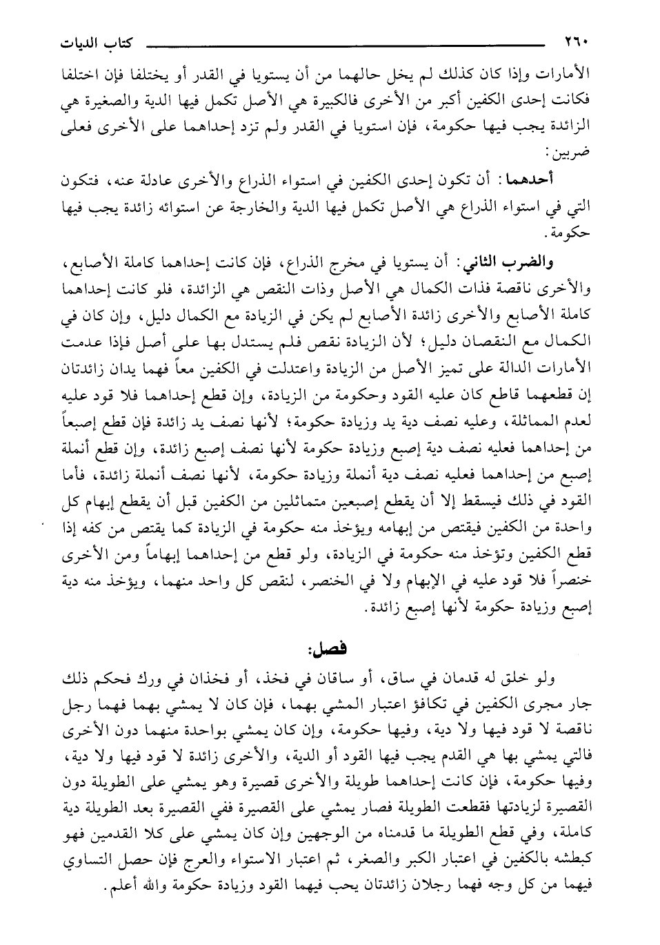 الأمارات وإذا كان كذلك لم يخل حالهما من أن يستويا في القدر أو يختلفا فإن اختلفا فكانت إحدى الكفين أكبر من الأخرى فالكبيرة هي الأصل تكمل فيها الدية والصغيرة هيا الزائدة يجب فيها حكومة, فإن استويا في القدر ولم تزد إحداهما على الأخرى فعلى ضربين: