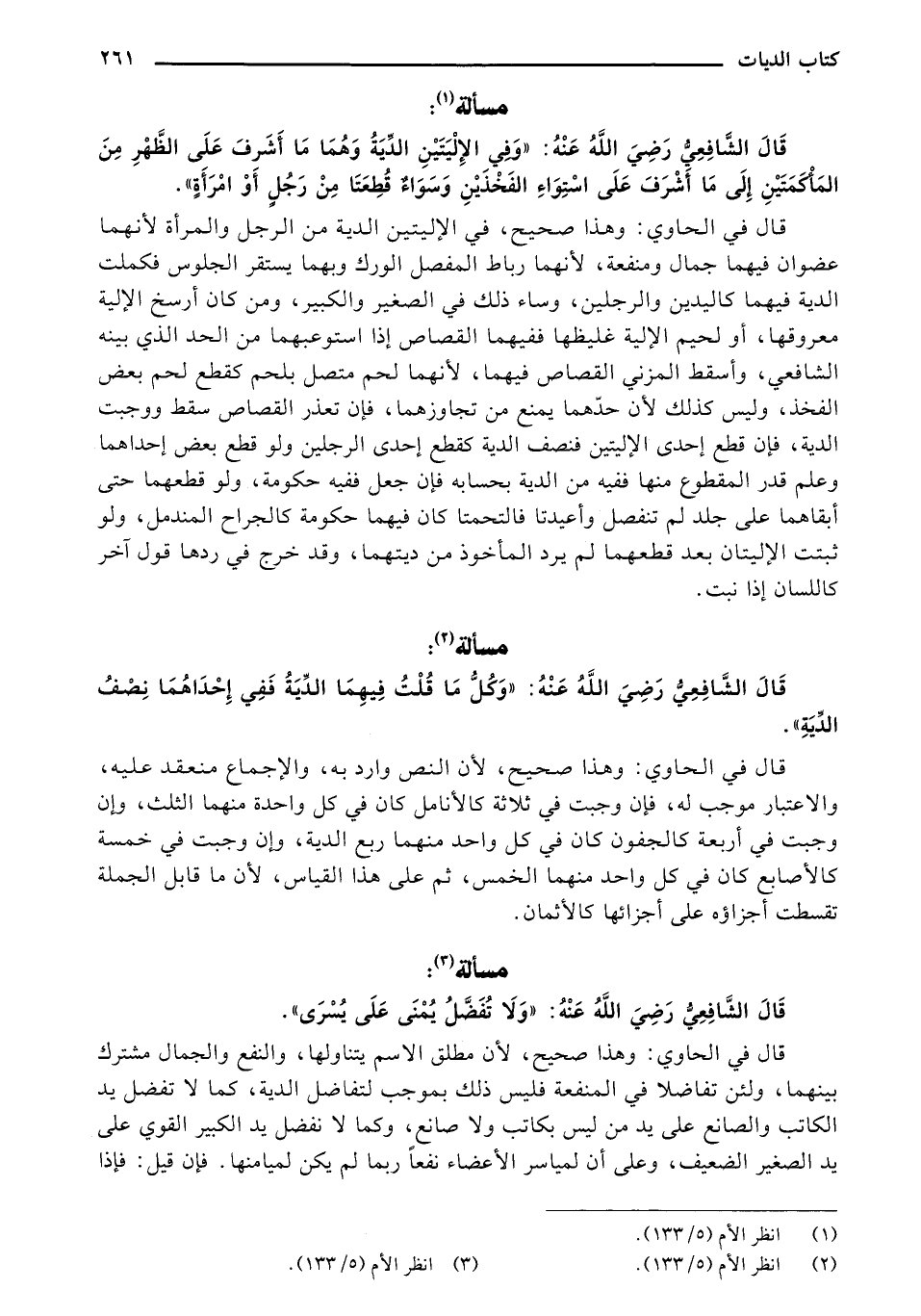 قال الشافعي رضي الله عنه: "وفي الإليتين الدية وهما ما أشرف على الظهر من المأكمتين إلى ما أشرف على استواء الفخذين وسواء قطعتها من رجل أو امرأة".