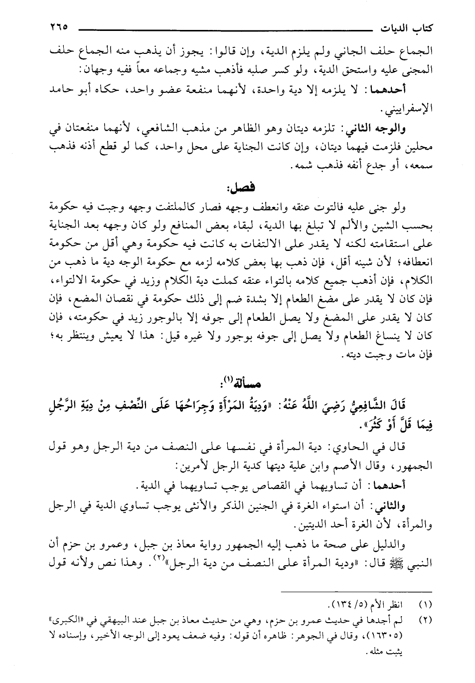 قال الشافعي رضي الله عنه: "ودية المرأة وجراحها على النصف من دية الرجل فيما قل أو كثر".