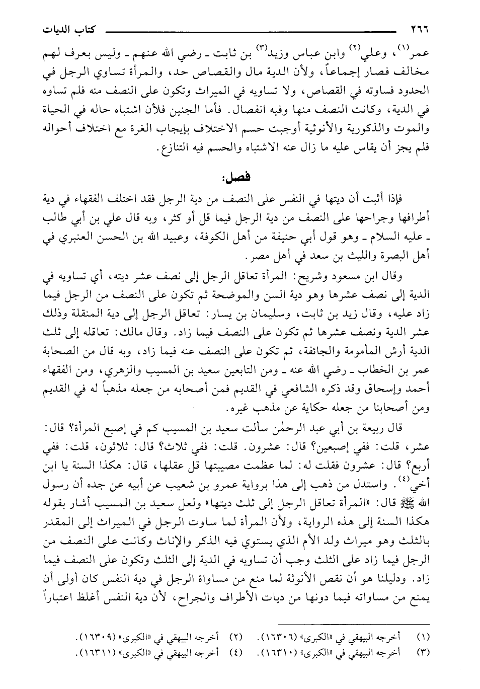 عمر, وعلي, وابن عباس, وزيد بن ثابت - رضي الله عنهم - وليس بعرف لهم مخالف فصار إجماعًا, ولأن الدية مال والقصاص حد, والمرأة تساوي الرجل في الحدود فساوته في القصاص, ولا تساويه في الميراث وتكون على النصف منه لم تساوه في الدية, وكانت النصف منها وفيه انفصال, فأما الجنين فلأن اشتباه حاله في الحياة والموت والذكورية والأنوثية أوجبت حسم الاختلاف بإيجاب الغرة مع اختلاف أحواله فلم يجز أن يقاس عليه ما زال عنه الاشتباه والحسم فيه التنازع.