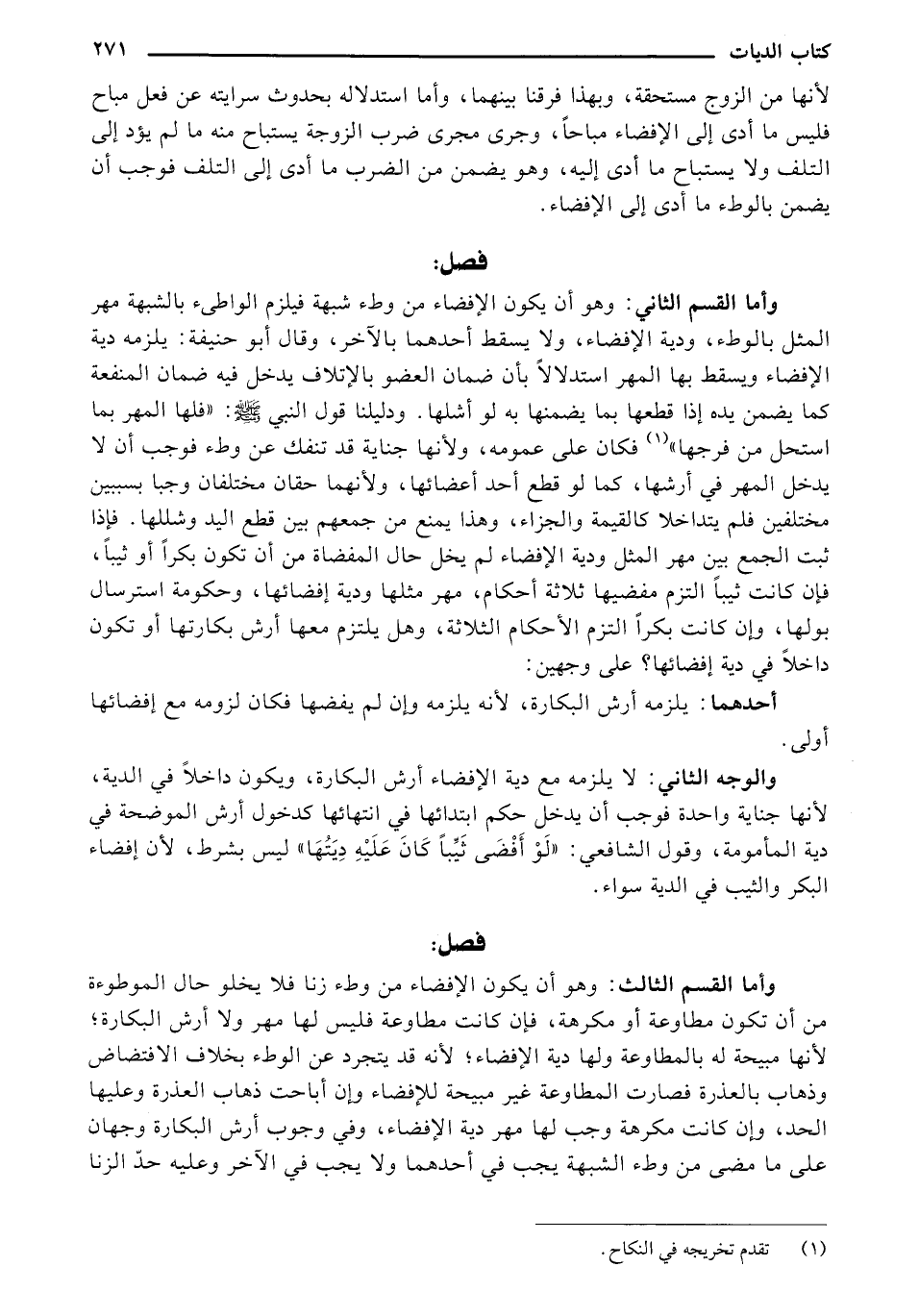 وأما القسم الثاني: وهو أن يكون الإفضاء من وطء شبهة فيلزم الواطئ بالشبهة مهر المثل بالوطء, ودية الإفضاء, ولا يسقط أحدهما بالآخر, وقال أبو حنيفة: يلزمه دية الإفضاء ويسقط بها المهر استدلالًا بأن ضمان العضو بإتلاف يدخل فيه ضمان المنفعة كما يضمن يده إذا قطعها بما يضمنها به لو أشلها, ودليلنا قول النبي صلى الله عليه وسلم: "فلها المهر بما استحل من فرجها" فكان على عمومه, ولأنها جناية قد تنفك عن وطء فوجب أن لا يدخل المهر في أرشها, كما لو قطع أحد أعضائها, ولأنهما حقان مختلفان وجبا بسببين مختلفين فلم يتداخلا كالقيمة والجزاء, وهذا يمنع من جمعهم بين قطع اليد وشللها, فإذا ثبت الجمع بين مهر المثل ودية الإفضاء لم يخل حال المفضاة من أن تكون بكرًا أو ثيبًا, فإن كانت ثيبًا التزم مفضيها ثلاثة أحكام, مهر مثلها ودية إفضائها, وحكومة استرسال بولها, وإن كانت بكرًا التزم الأحكام الثلاثة, وهل يلتزم معها أرش بكارتها أو تكون داخلًا في دية إفضائها؟ على وجهين: