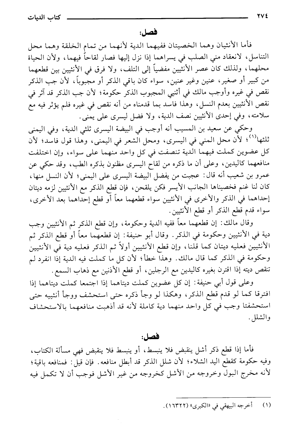 فأما الأنثيان وهم الخصيتان ففيهما الدية لأنهما من تمام الخلقة وهما محل التناسل, لانعقاد مني الصلب في يسراهما إذا نزل غليها فصار لقاحًا فيهما, ولأن الحياة محلهما, ولذلك كان عصر الأنثيين مفضيًا إلى التلف, ولا فرق في الأنثيين بين قطعهما من كبير أو صغير, عنين أو غير عنين, سواء كان باقي الذكر أو مجبوبًا, لأن جب الذكر نقص في غيره وأوجب مالك في أثنيي المجبوب الذكر حكومة؛ لأن جب الذكر قد آثر في نقص الأنثيين بعد النسل, وهذا فاسد بما قدمناه من أنه نقص في غيره فلم يؤثر فيه مع سلامته, وفي إحدى الأنثيين نصف الدية, ولا فضل ليسرى على يمنى.