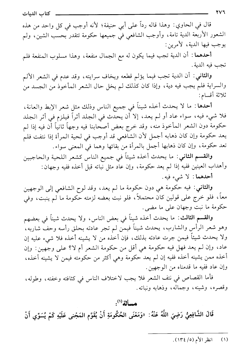 والقسم الثالث: ما يحدث أخذه شيئًا في بعض الناس, ولا يحدث شيئًا في بعضهم وهو شعر الرأس والشارب, يحدث شينًا فيمن لم تجر عادته بحلق رأسه وحف شاربه, ولا يحدث شيئًا فيمن جرت عادته بذلك, فإن أخذه من لا يشينه أخذه فلا شيء عليه إن عاد, وإن لم يعد فهل فيه حكومة هي أقل من حكومة الشعر أم لا؟ على وجهين: وإن أخذه ممن يشينه أخذه ففيه إن لم يعد حكومة وهي أكثر من حكومته فيمن لا يشينه أخذه, وإن عاد ففيه ما قدمناه من الوجهين.