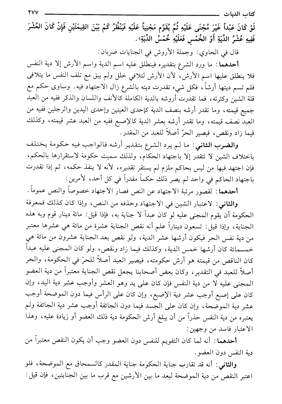 والثاني: لاعتبار الشين في الاجتهاد وحذفه من النص, وإذا كان كذلك فمعرفة الحكومة أن يقوم المجني عليه لو كان عبدًا لا جناية به, فإذا قيل: مائة دينار قوم وبه هذه الجناية, وإذا قيل: تسعون دينارًا علم أنه نقص الجناية عشرة من مائة هي عشرها معتبر من دية نفس الحر فيكون أرشها عشر الدية, ولو نقص بعد الجناية عشرون من مائة هي خمسمائة كان أرشها خمس الدية, وكذلك فيما زاد ونقص, ولو كان المجني عليه عبدًا كان الناقص من قيمته هو أرش حكومته, فيصير العبد أصلًا للحر في الحكومة, والحر أصلًا للعبد في التقدير, وكان بعض أصحابنا يجعل نقص الجناية معتبرًا من دية العضو المجني عليه لا من دية النفس فإن كان على يد وهو العشر وأوجب عشر دية اليد, وإن عشر دية الموضحة, وإن كان على الجسد فيما دون الجائفة أوجب عشر دية الجائفة ولم يعتبره من دية النفس حذرًا من أن يبلغ أرش الحكومة دية ذلك العضو أو زيادة عليه, وهذا الاعتبار فاسد من وجهين: