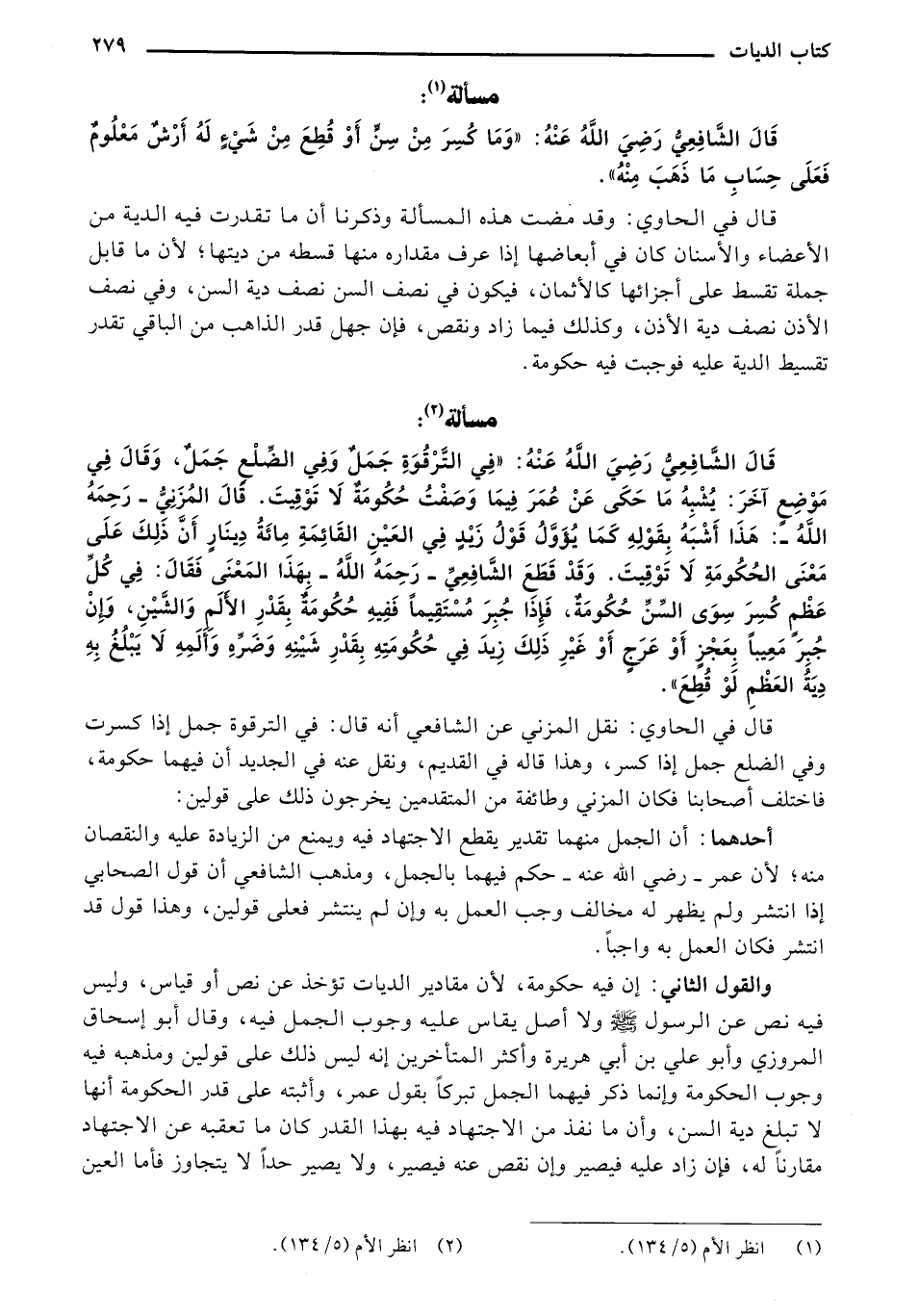 قال الشافعي رضي الله عنه: "وما كسر من سن أو قطع من شيء له أرش معلوم فعلى حساب ما ذهب منه".