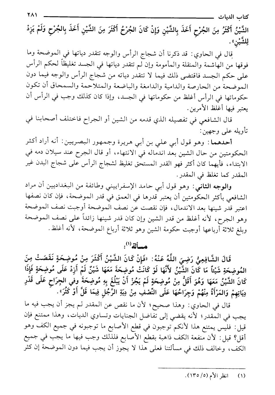 قال الشافعي رضي الله عنه: "فإن كان الشين أكثر من موحضة نقصت من الموضحة شيئًا ما كان الشين لأنها لو كانت موضحة معها شين لم أزد على موضحة فإذا كان الشين معها وهو أقل من موضحة لم يجز أن يبلغ به موضحة وفي الجراح على قدر دياتهم والمرأة منهم وجراحها على النصف من دية الرجل فيما قل أو كثر".