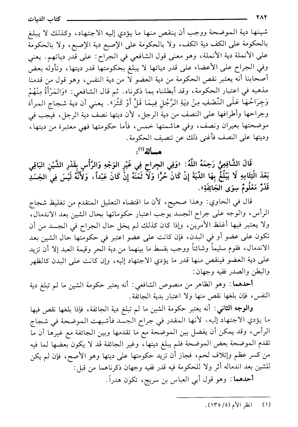 شينها دية الموضحة ووجب أن ينقص منها ما يؤدي إليه الاجتهاد, وكذلك لا يبلغ بالحكومة على الكف دية الكف, ولا بالحكومة على الإصبع دية الإصبع, ولا بالحكومة على الأنملة دية الأنملة, وهو معنى قول الشافعي في الجراح: على قدر ديتها, وتأوله بعض أصحابنا أنه يعتبر نقص الحكومة من دية العضو لا من دية النفس, وهو قول من قدمنا مذهبه في اعتبار الحكومة, وقد أبطلناه بما ذكرناه, ثم قال الشافعي: "والمرأة منهم وجراحها على النصف من دية الرجل فيما قل أو كثر", يعني أن دية شجاج المرأة وجراحها وأطرافها على النصف من دية الرجل, لأن ديتها نصف دية الرجل, فيجب في موضحتها بعيران ونصف, وفي هاشمتها خمس, فأما حكومتها فهي معتبرة من ديتها, وديتها على النصف فأغنى ذلك عن تنصيف الحكومة.