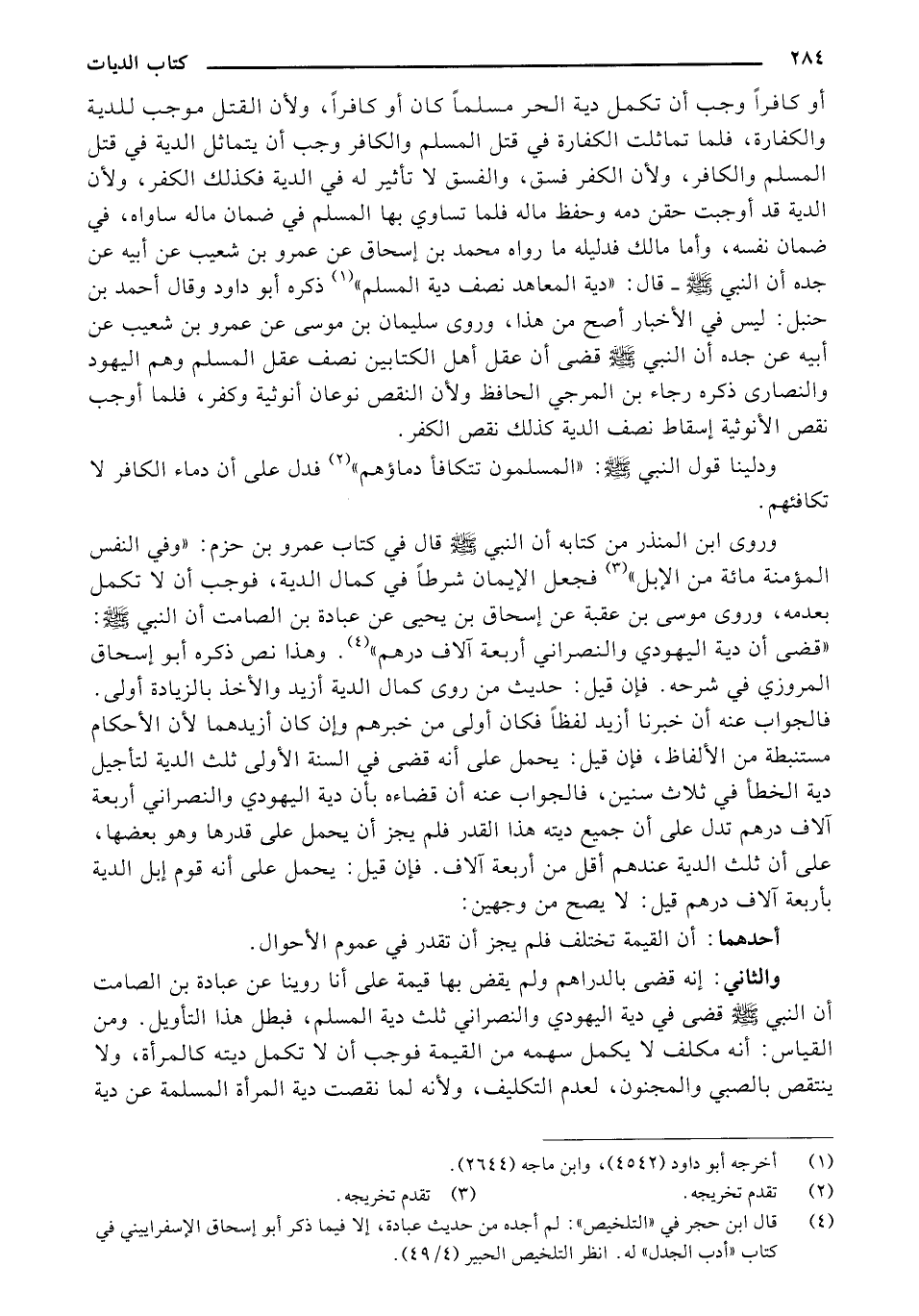 وروى ابن المنذر من كتابه أن النبي صلى الله عليه وسلم قال في كتاب عمرو بن حزم: "وفي النفس المؤمنة مائة من الإبل" فجعل الإيمان شرطًا في كمال الدية, فوجب أن لا تكمل بعدمه, وروى موسى بن عقبة عن إسحاق بن يحيى عن عبادة بن الصامت أن النبي صلى الله عليه وسلم: "قضى أن دية اليهودي والنصراني أربعة آلاف درهم" , وهذا نص ذكره أبو إسحاق المروزي في شرحه, فإن قيل: حديث من روى كمال الدية أزيد والأخذ بالزيادة لأن الأحكام مستنبطة من الألفاظ, فإن قيل: يحمل على أنه قضى في السنة الأولى ثلث الدية لتأجيل دية الخطأ في ثلاث سنين, فالجواب عنه أن قضاءه بأن دية اليهودي والنصراني أربعة آلاف درهم تدل على أن جميع ديته هذا القدر فلم يجز أن يحمل على قدرها وهو بعضها, على أن ثلث الدية عندهم أقل من أربعة آلاف, فإن قيل: يحمل على أنه قوم إبل الدية بأربعة آلاف درهم قيل: لا يصح من وجهين: