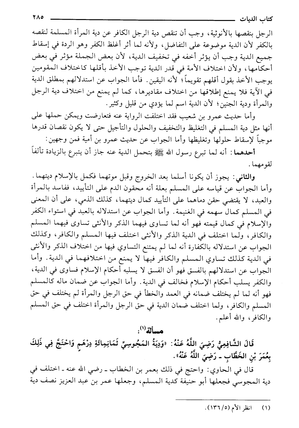 والثاني: يجوز أن يكونا أسلما بعد الخروج وقبل موتهما فكمل بالإسلام ديتهما, وأما الجواب عن قياسه على السلم بعلة أنه محقون الدم على التأييد, ففاسد بالمرأة والعبد, لا يقتضي حقن دماهما على التأييد كمال ديتهما, كذلك الذمي, على أن المعنى في المسلم كمال سهمه في الغنيمة, وأما الجواب عند استدلاله بالعبد في استواء الكفر والإسلام في كمال قيمته فهو أنها لما تساوى فيهما الذكر والأنثى تساوى فيهما المسلم والكافر, ولما اختلف في الدية الذكر والأنثى اختلف فيها المسلم والكافر, وكذلك الجواب عن استدلاله بالكفارة أنه لما لم يمتنع التساوي فيها من اختلاف الذكر والأنثى في الدية كذلك تساوى المسلم والكافر فيها لا يمنع من اختلافهما في الدية, وأما الجواب عن استدلالهم بالفسق فهو أن الفسق لا يسلبه أحكام الإسلام فساوى في الدية, والكفر يسلب أحكام الإسلام فخالف في الدية, وأما الجواب عن ضمان ماله كالمسلم فهو أنه لما لم يختلف ضمانه في العمد والخطأ في حق الرجل والمرأة لم يختلف في حق المسلم والكافر, ولما اختلف ضمان الدية في حق الرجل والمرأة اختلف في حق المسلم والكافر والله أعلم.