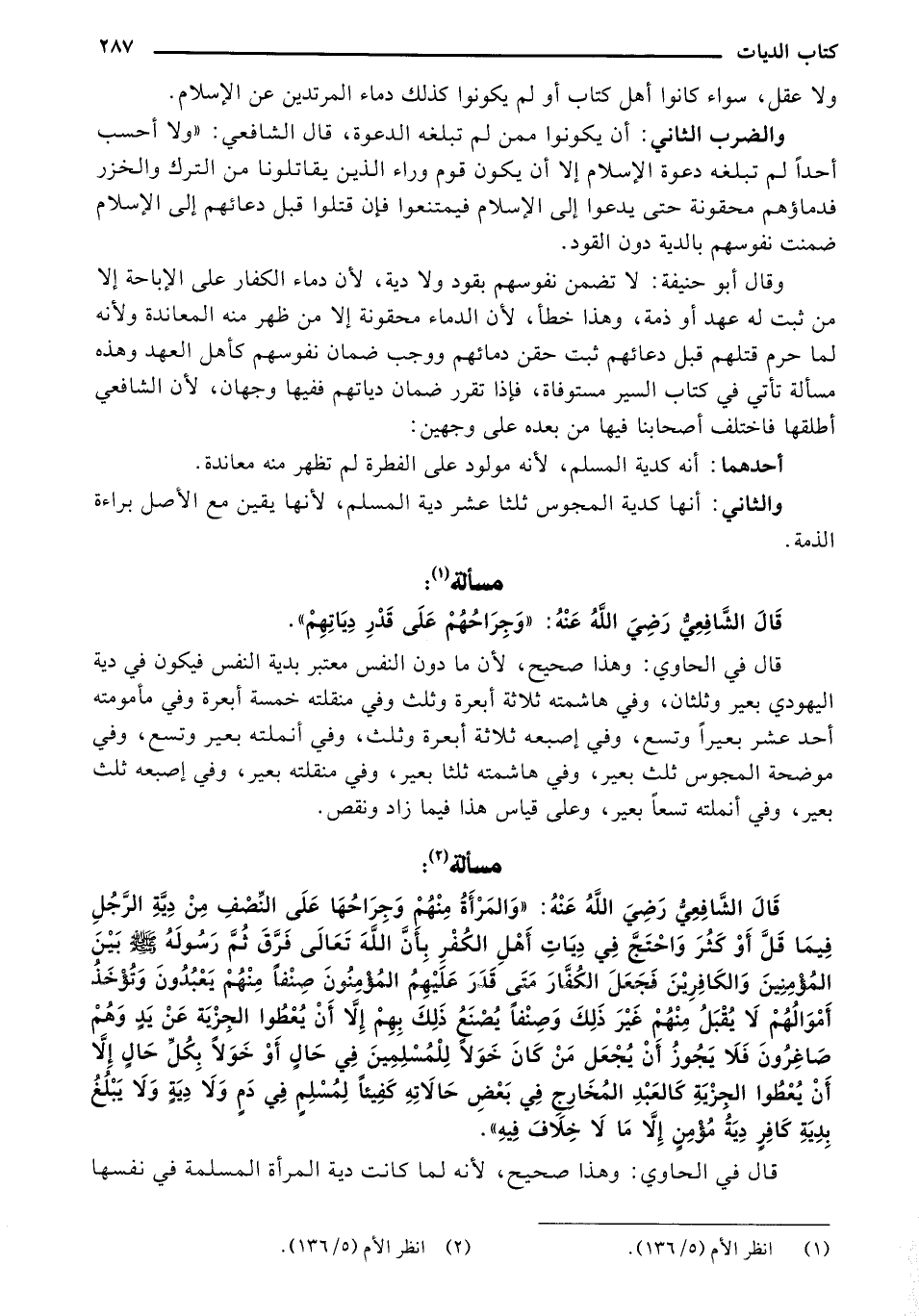 قال الشافعي رضي الله عنه: "والمرأة منهم وجراحها على النصف من دية الرجل فيما قل أو كثر واحتج في ديات أهل الكفر بأن الله تعالى فرق ثم رسوله صلى الله عليه وسلم بين المؤمنين والكافرين فجعل الكفار متى قدر عليهم المؤمنون صنفًا منهم يعبدون وتؤخذ أموالهم لا يقبل منهم غير ذلك وصنفًا يصنع ذلك بهم إلا أن يعطوا الجزية عن يد وهم صاغرون فلا يجوز أن يجعل من كان خولا للمسلمين في حال أو خولا بكل حال إلا أن يعطوا الجزية كالعبد المخارج في بعض حالاته كفيئًا لمسلم في دم ولا دية يبلغ بدية كافر دية مؤمن إلا ما لا خلاف فيه".