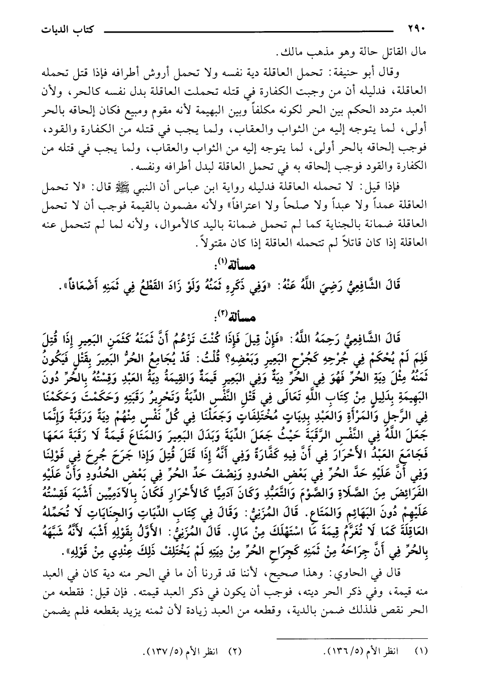 قال الشافعي رحمه الله: "فإن قيل فإذا كنت تزعم أن ثمنه كثمن البعير إذا قتل فلم لم يحكم في جرحه كجرح البعير وبعضه؟ قلت: قد يجامع الحر البعير بقتل فيكون ثمنه مثل دية الحر فهو في الحر دية وفي البعير قيمة والقيمة دية العبد وقسته بالحر دون البهيمة بدليل من كتاب الله تعالى في قتل النفس الدية وتحرير رقبته وحكمت وحكمنا في الرجل والمرأة والعبد بديات مختلفات وجعلنا في كل نفس منهم دية ورقبة وإنما جعل الله في النفس الرقبة حيث جعل الدية وبدل البعير والمتاع قيمة لا رقبة معها فجامع العبد الأحرار في أن فيه كفارة وفي أنه إذا قتل قتل وإذا جرح جرح في قولنا وفي أن عليه حد الحر في بعض الحدود ونصف حد الحر في بعض الحدود وأن عليه الفرائض من الصلاة والصوم والتعبد وكان آدميًا كالأحرار فكان بالآدميين أشبه فقسته عليهم دون البهائم والمتاع, قال المزني: وقال في كتاب الديات والجنايات لا تحمله العاقلة كما لا تغرم قيمة ما استهلك من مال, قال المزني: الأول بقوله أشبه لأنه شبهه بالحر في أن جراحه من ثمنه كجراح الحر من ديته لم يختلف ذلك عندي من قوله".
