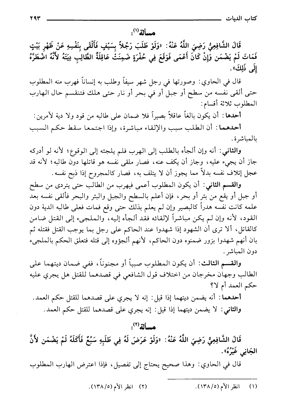 قال في الحاوي: وصورتها في رجل شهر سيفًا وطلب به إنسانًا فهرب منه المطلوب حتى ألقى نفسه من سطح أو جبل أو في بحر أو نار حتى هلك فتنقسم حال الهارب المطلوب ثلاثة أقسام: