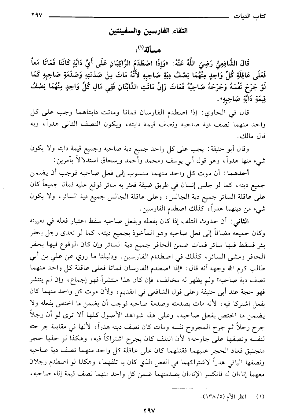 قال الشافعي رضي الله عنه: "وإذا اصطدم الراكبان على أي دابة كانتا فماتا معًا فعلى عاقلة كل واحد منهما نصف دية صاحبة لأنه مات من صدمته وصدمة صاحبه كما لو جرح نفسه وجرحه صاحبه فمات وإن ماتت الدابتان ففي مال كل واحد منهما نصف قيمة دابة صاحبه".
