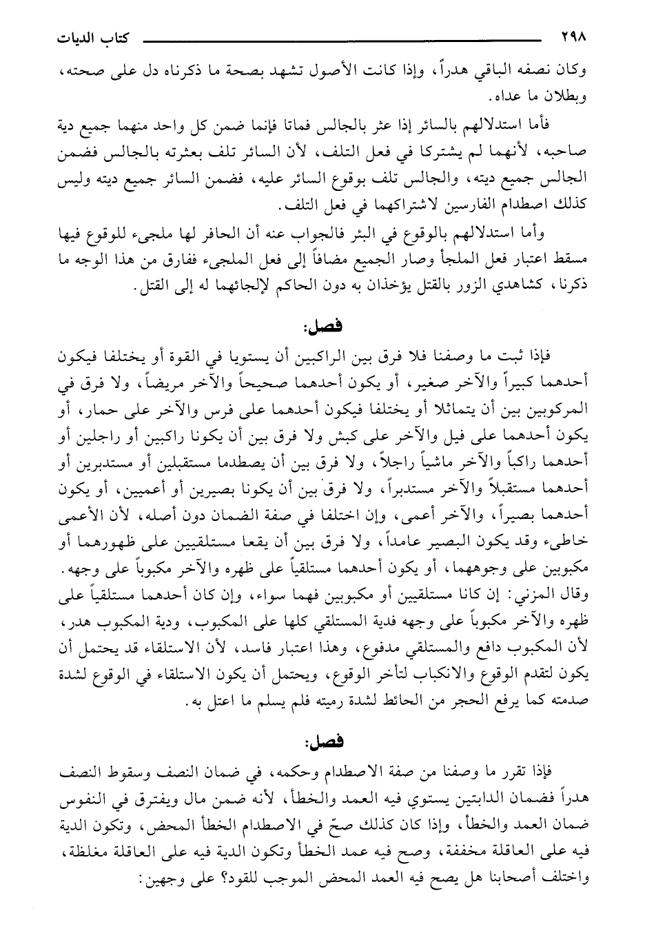 فإذا ثبت ما وصفنا فلا فرق بين الراكبين أن يستويا في القوة أو يختلفا فيكون أحدهما كبيرًا والآخر صغير, أو يكون أحدهما صحيحًا والآخر مريضًا, ولا فرق في المركوبين بين أن يتماثلا أو يختلفا فيكون أحدهما على فرس والآخر على حمار, أو يكون أحدهما على فيل والآخر على كبش ولا فرق بين أن يكونا راكبين أو راجلين أو أحدهما راكبًا والآخر ماشيًا راجلًا, ولا فرق بين أن يصطدما مستقبلين أو مستدبرين أو أحدهما مستقبلًا والآخر مستدبرًا, ولا فرق بين أن يكونا بصيرين أو أعميين, أو يكون أحدهما بصيرًا, والآخر أعمى, وإن اختلفا في صفة الضمان دون أصله, لأن الأعمى خاطئ وقد يكون البصير عامدًا, ولا فرق بين أن يقعا مستلقيين على ظهورهما أو مكبوبين على وجهه فدية المستلقي كلها على المكبوب, ودية المكبوب هدر, لأن المكبوب دافع والمستلقي مدفوع, وهذا اعتبار فاسد, لأن الاستلقاء قد يحتمل أن يكون لتقدم الوقوع والانكباب لتأخر الوقوع, ويحتمل أن يكون الاستلقاء في الوقوع لشدة صدمته كما يرفع الحجر من الحائط لشدة رميته فلم يسلم ما اعتل به.