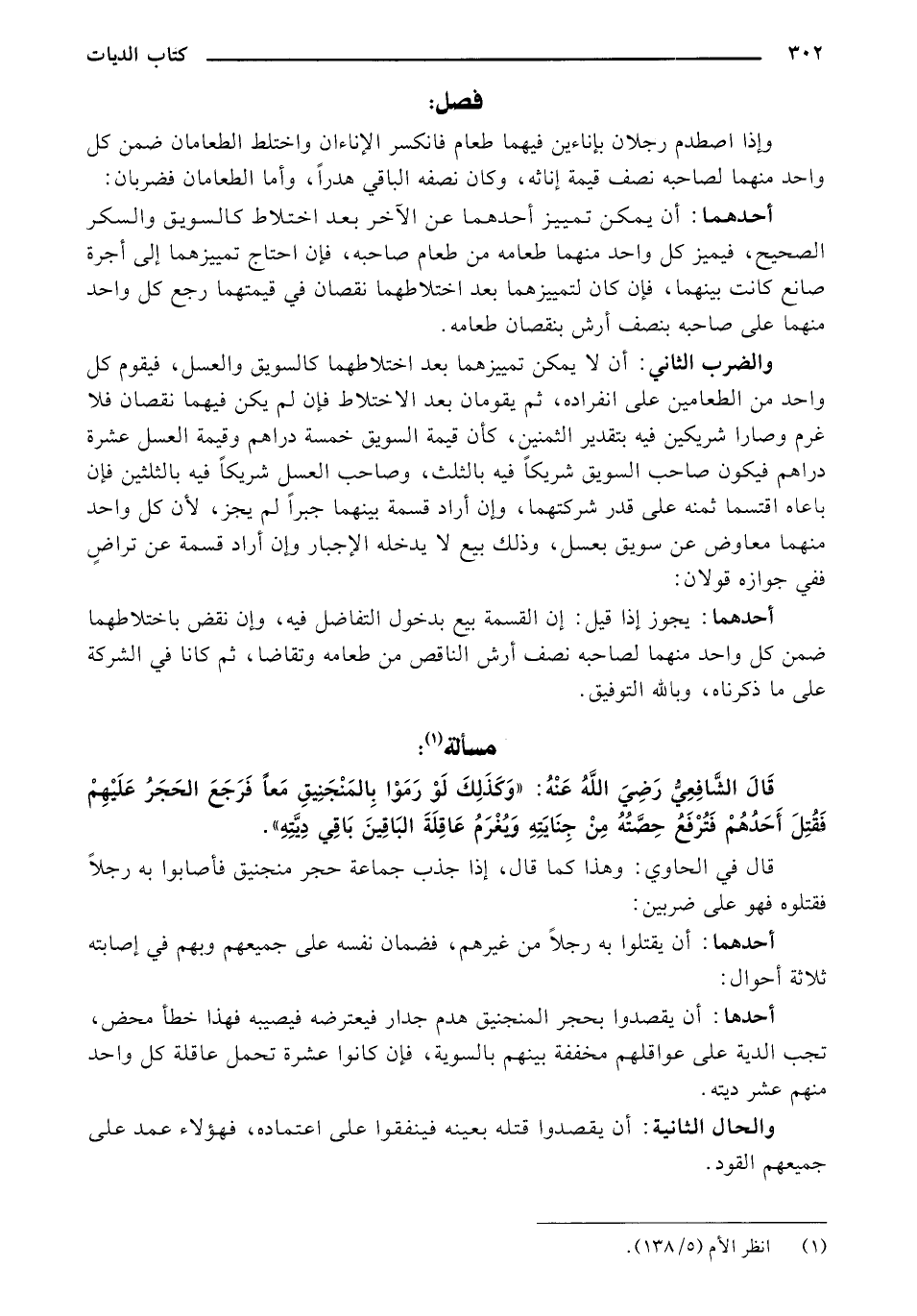وإذا اصطدم رجلان بإناءين فيهما طعام فانكسر الإناءان واختلط الطعامان ضمن كل واحد منهما لصاحبه نصف قيمة إناثه، وكان نصفه الباقي هدرا، وأما الطعامان فضربان: