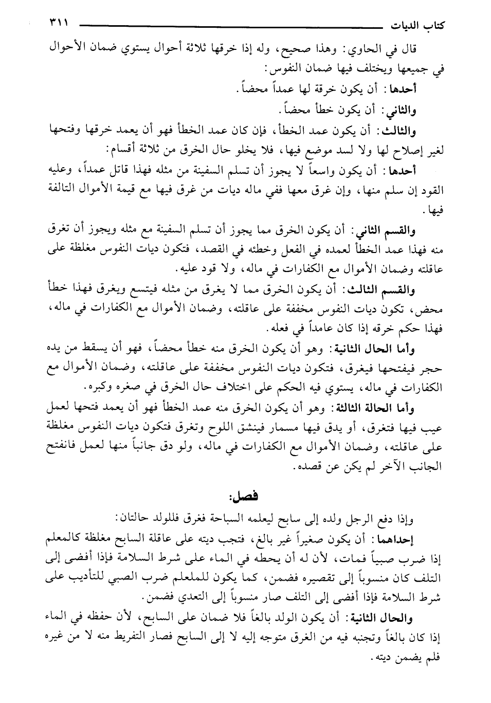 والقسم الثاني: أن يكون الخرق مما يجوز أن تسلم السفينة مع مثله ويجوز أن تغرق منه فهذا عمد الخطأ لعمده في الفعل وخطئه في القصد، فتكون ديات النفوس مغلظة على عاقلته وضمان الأموال مع الكفارات في ماله، ولا قود عليه.