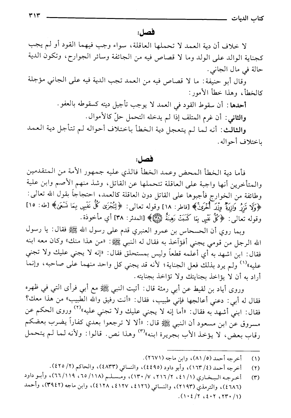 وروي أياد بن لقيط عن أبي رمثة قال: أتيت النبي صلى الله عليه وسلم مع أبي فرأى التي في ظهره فقال له أبي: دعني أعالجها فإني طبيب، فقال: "أنت رفيق والله الطبيب" من هذا معك؟ فقال: ابني أشهد به فقال: "أما إنه لا يجني عليك ولا تجني عليه" وروي الحكم عن مسروق عن ابن مسعود أن النبي صلى الله عليه وسلم قال: "ألا لا ترجعوا بعدي كفارًا يضرب بعضكم رقاب بعض، لا يؤخذ الأب بجريرة ابنه" وهذا نص. قالوا: ولأنه لما لم يتحمل