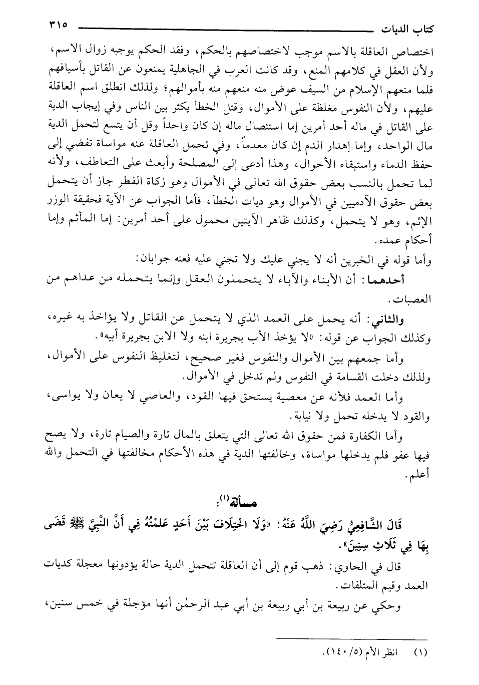 اختصاص العاقلة بالاسم موجب لاختصاصهم بالحكم، وفقد الحكم يوجبه زوال الاسم، ولأن العقل في كلامهم المنع، وقد كانت العرب في الجاهلية يمنعون عن القاتل بأسيافهم فلما منعهم الإسلام من السيف عوض منه منعهم منه بأموالهم؛ ولذلك انطلق اسم العاقلة عليهم، ولأن النفوس مغلظة على الأموال، وقتل الخطأ يكثر بين الناس وفي إيجاب الدية على القاتل في ماله أحد أمرين إما استئصال ماله إن كان واحدًا وقل أن يتسع لتحمل الدية مال الواحد، وإما إهدار الدم إن كان معدمًا، وفي تحمل العاقلة عنه مواساة تفضي إلى حفظ الدماء واستبقاء الأحوال، وهذا أدعى إلى المصلحة وأبعث على التعاطف، ولأنه لما تحمل بالنسب بعض حقوق الله تعالى في الأموال وهو زكاة الفطر جاز أن يتحمل بعض حقوق الآدميين في الأموال وهو ديات الخطأ، فأما الجواب عن الآية فحقيقة الوزر الإثم، وهو لا يتحمل، وكذلك ظاهر الآيتين محمول على أحد أمرين: إما المأثم وإما أحكام عمده.