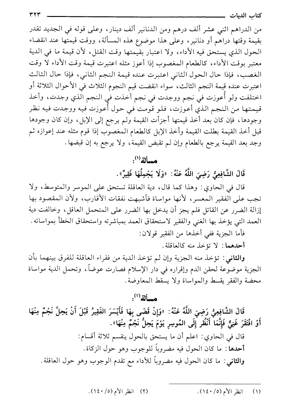 من الدراهم اثني عشر ألف درهم ومن الدنانير ألف دينار، وعلى قوله في الجديد تقدر بقيمة وقتها دراهم أو دنانير، وعلى هذا موضوع هذه المسألة، ووقت قيمتها عند انقضاء الحول الذي يستحق فيه الأداء، ولا اعتبار بقيمتها وقت القتل، لأن قيمة ما في الدية معتبر بوقت الأداء، كالطعام المغصوب إذا مثله اعتبرت قيمة وقت الأداء لا وقت الغصب، فإذا حال الحول الثاني اعتبرت عنده قيمة النجم الثاني، فإذ حال الثالث اعتبرت عنده قيمة النجم الثالث، سواء انقضت قيم النجوم الثلاث في الأحوال الثلاثة أو اختلفت ولو أعوزت في نجم ووجدت في نجم أخذت في النجم الذي وجدت، وأخذ قيمتها من النجم الذي أعوزت، فلو قومت في حول أعوزت فيه ووجدت فيه نظر وجودها، فإن كان بعد أخذ قيمتها أجزأت القيمة ولم يرجع إلى الإبل، وإن كان وجودها قبل أخذ القيمة بطلت القيمة وأخذ الإبل كالطعام المغصوب إذا قوم مثله عند إعوازه ثم وجد بعد القيمة يرجع بالطعام وإن لم تقبض القيمة، ولا يرجع به إن قبضها.