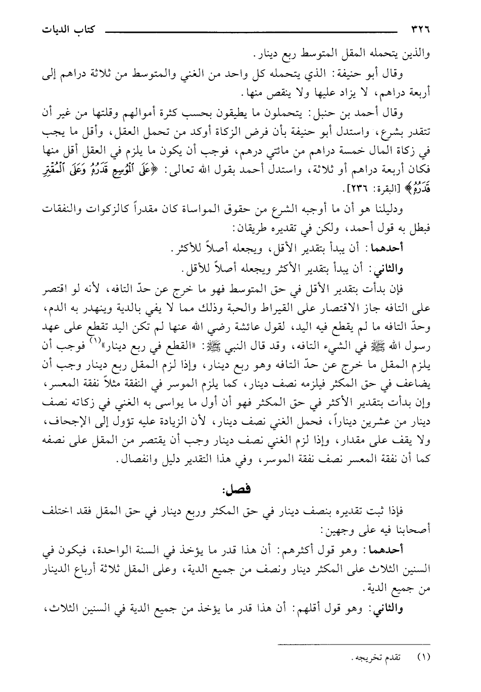 فإن بدأت بتقدير الأقل في حق المتوسط فهو ما خرج عن حد التافه، لأنه لو اقتصر على التافه جاز الاقتصار على القيراط والحبة وذلك مما لا يفي بالدية وينهدر به الدم، وحد التافه ما لم يقطع فيه اليد، لقول عائشة رضي الله عنها لم تكن اليد تقطع على عهد رسول الله صلى الله عليه وسلم في الشيء التافه، وقد قال النبي صلى الله عليه وسلم: "القطع في ربع دينار" فوجب أن يضاعف في حق المكثر فيلزمه نصف دينار، كما يلزم الموسر في النفقة مثلًا نفقة المعسر، وإن بدأت بتقدير الأكثر في حق المكثر فهو أن أول ما يواسى به الغني في زكاته نصف دينار من عشرين دينارًا، فحمل الغني نصف دينار، لأن الزيادة عليه تؤول إلى الإجحاف، ولا يقف على مقدار، وإذا لزم الغني نصف دينار وجب أن يقتصر من المقل على نصفه كما أن نفقة المعسر نصف نفقة الموسر، وفي هذا التقدير دليل وانفصال.