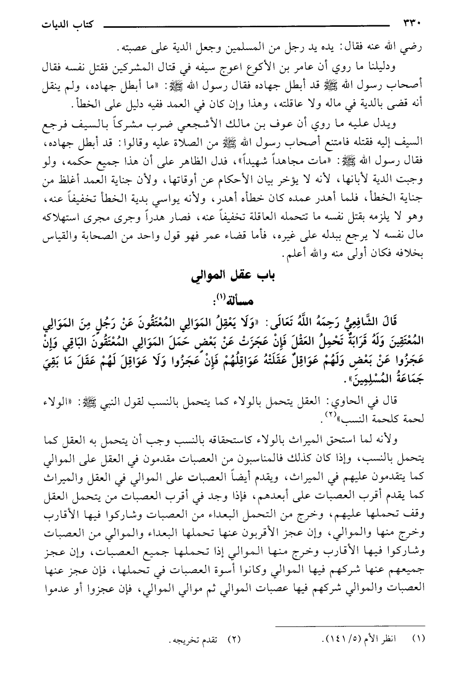 قال الشافعي رحمه الله تعالى: "ولا يعقل الموالي المعتقون عن رجلٍ من الموالي المعتقين وله قرابةٌ تحمل العقل فإن عجزت عن بعضٍ حمل الموالي المعتقون الباقي وإن عجزوا عن بعض ولهم عواقلٌ عقلته عواقلهم فإن عجزوا ولا عوقل لهم عقل ما بقي جماعة المسلمين".