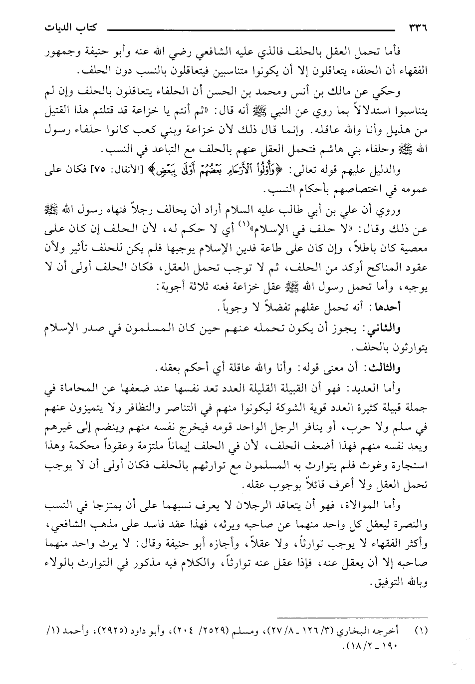 وروي أن علي بين أبي طالب عليه السلام أراد أن يحالف رجلًا فنهاه رسول الله صلى الله عليه وسلم عن ذلك وقال: "لا حلف في الإسلام" أي لا حكم له، لأن الحلف إن كان على معصية كان باطلًا، وإن كان على طاعة فدين الإسلام يوجبها فلم يكن للحلف تأثير ولأن عقود المناكح أوكد من الحلف، ثم لا توجب تحمل العقل، فكان الحلف أولى أن لا يوجبه، وأما تحمل رسول الله صلى الله عليه وسلم عقل خزاعة فعنه ثلاثة أجوبة: