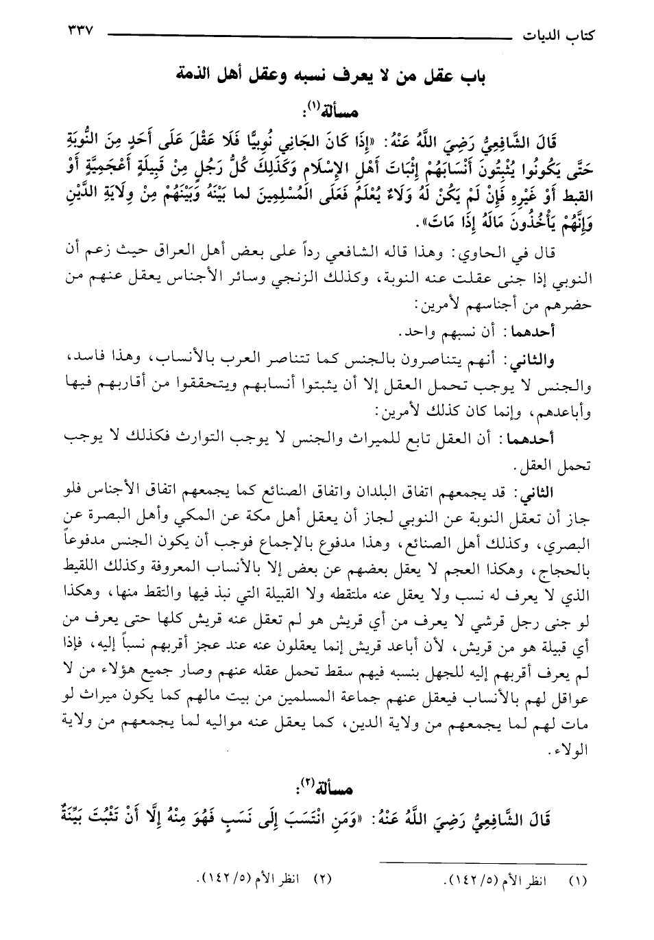 قال الشافعي رضي الله عنه" "إذا كان الجاني نُوبيًا فلا عقل على أحدٍ من النوبة حتى يكونوا يُثبتون أنسابهم إثبات أهل الإسلام وكذلك كل رجلٍ من قبيلةٍ أعجميةٍ أو القبط أو غيره فإن لم يكن له ولاءٌ يعلم فعلى المسلمين لما بينه وبينهم من ولاية الدين وإنهم يأخذون ماله إذا مات".
