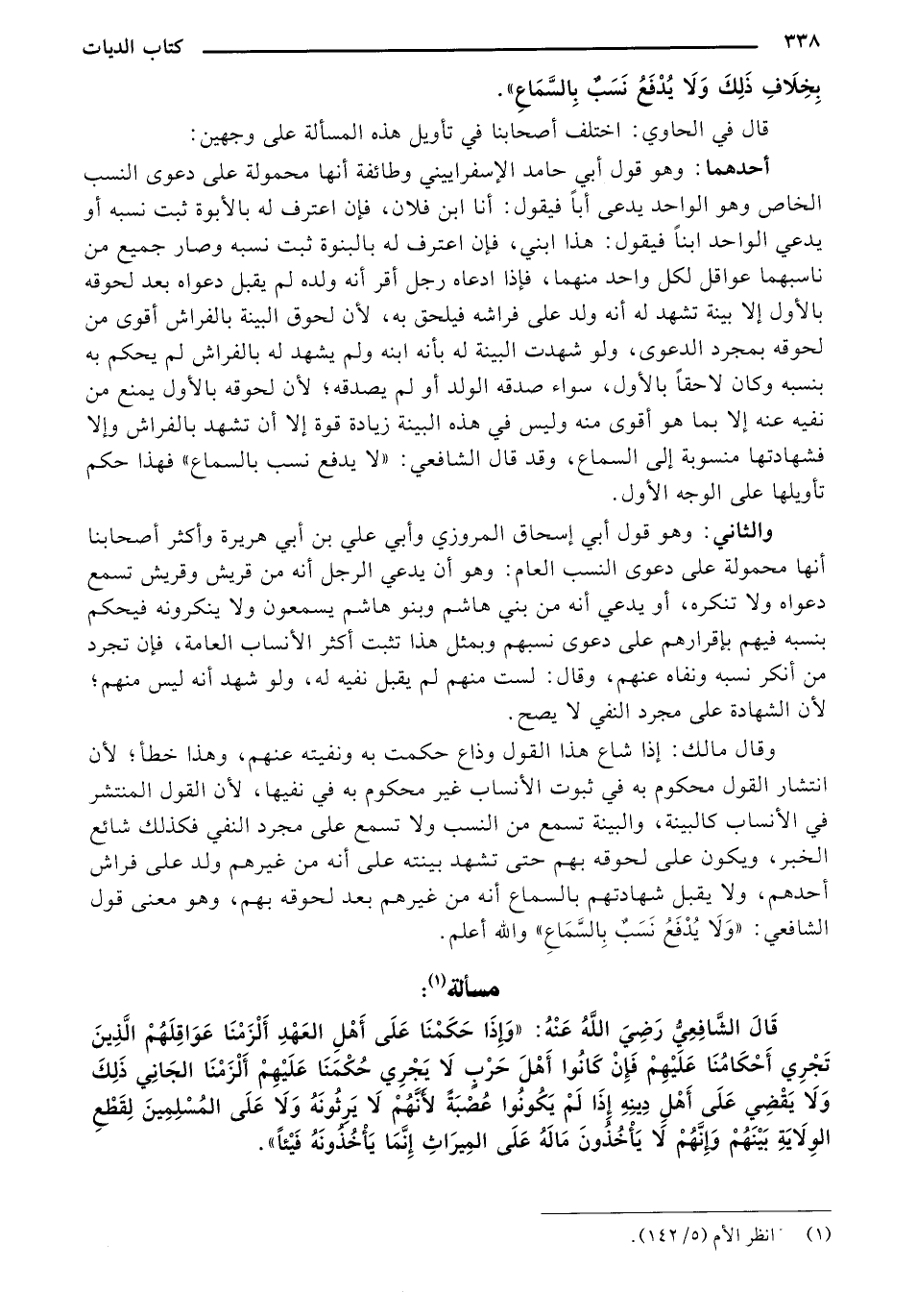 أحدهما: وهو قول أبي حامد الإسفراييني وطائفة أنها محمولة على دعوى النسب الخاص وهو الواحد يدعى أبًا فيقول: أنا ابن فلان، فإن اعترف له بالأبوة ثبت نسبه أو يدعي الواد ابنًا فيقول: هذا انبي، فإن اعترف له بالنبوة ثبت نسبه وصار جميع من ناسبهما عواقل لكل واحد منهما، فإذا ادعاه رجل أقر أنه ولده لم يقبل دعواه بعد لحوقه بالأول إلا بينة تشهد له أنه ولد على فراشه فيلحق به، لأن لحوق البينة بالفراش أقوى من لحوقه بمجرد الدعوى، ولو شهدت البينة له بأنه ابنه ولم يشهد له بالفراش لم يحكم به بنسبه وكان لاحقًا بالأول، سواء صدقه الولد أو لم يصدقه؛ لأن لحوقه بالأول يمنع من نفيه عنه إلا بما هو أقوى منه وليس في هذه البينة زيادة قوة إلا أن تشهد بالفراش وإلا فشهادتها منسوبة إلى السماع، وقد قال الشافعي: "لا يدفع نسب بالسماع" فهذا حكم تأويلها على الوجه الأول.