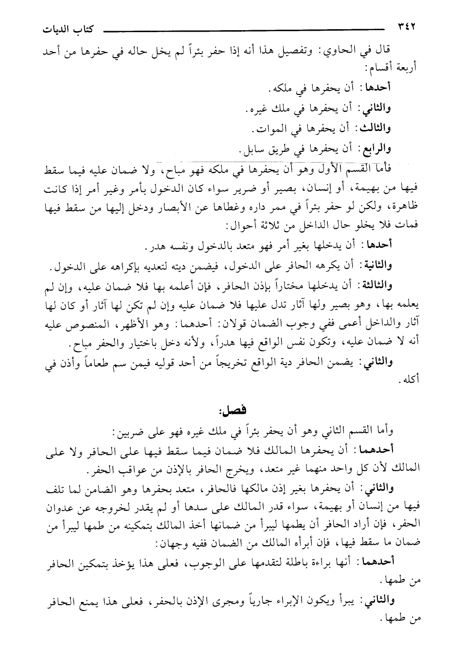 قال [في] الحاوي: وتفصيل هذا أنه إذا حفر بئرًا لم يخل حاله في حفرها من أحد أربعة أقسام: